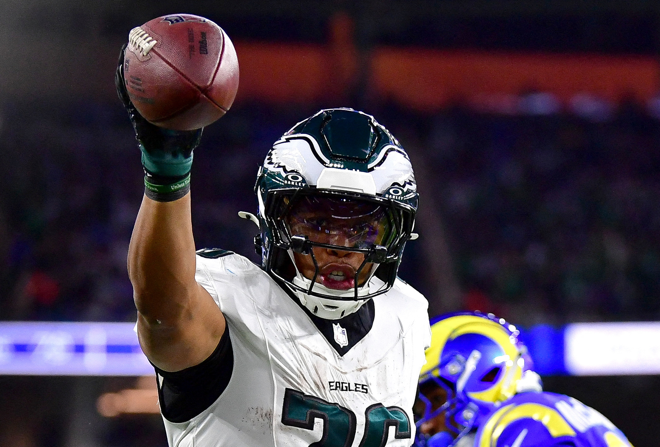 Philadelphia Eagles running back Saquon Barkley reacts after getting first down against the Los Angeles Rams during the second half at SoFi Stadium in Inglewood, California on November 25, 2024. (Photo by /Reuters). (Photo by Gary A. Vasquez/USA TODAY Sports)