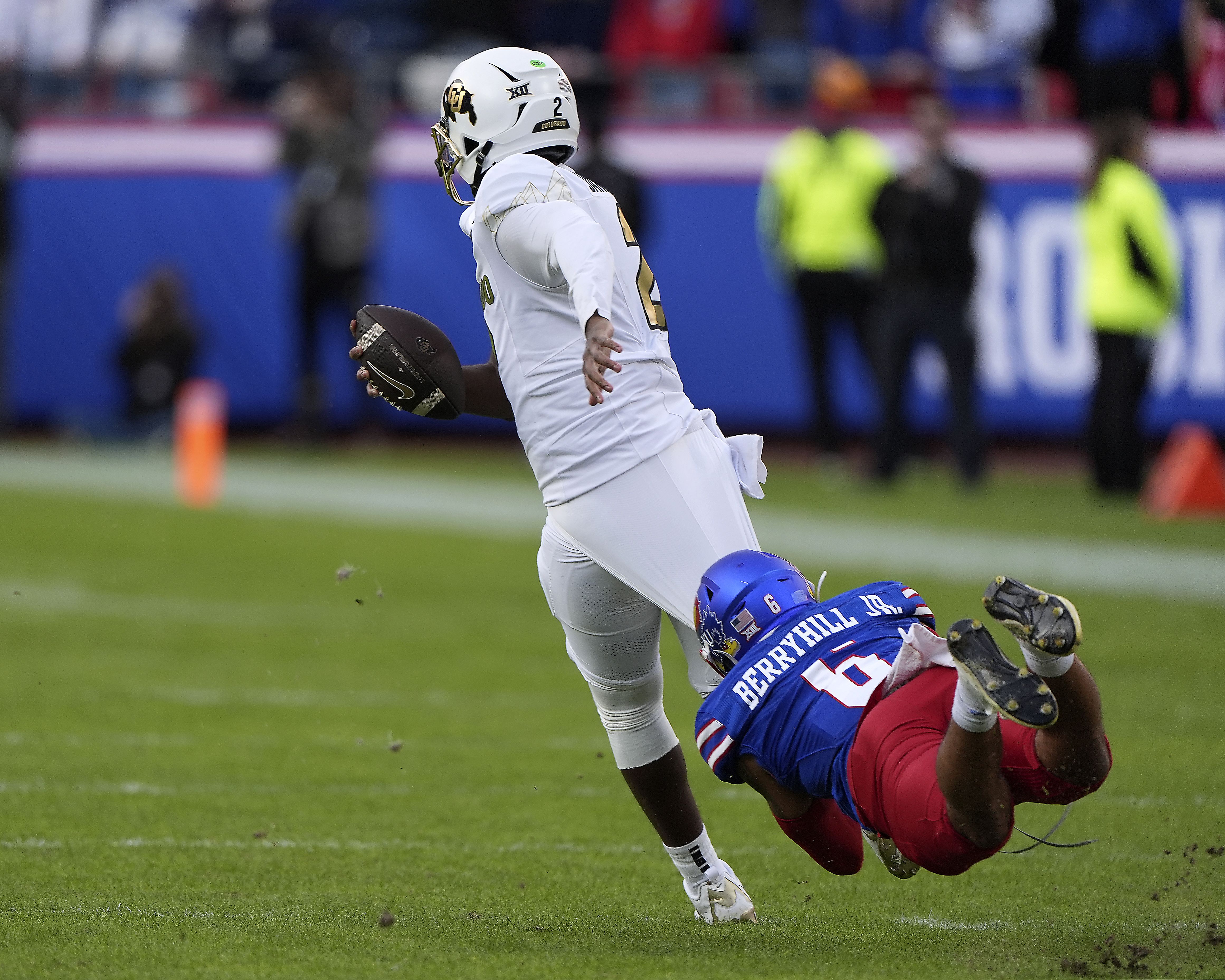 Kansas linebacker Taiwan Berryhill Jr. (6) tries to tackle Colorado quarterback Shedeur Sanders (2) during the first half of an NCAA college football game, Saturday, November 23, 2024, in Kansas City, Mo. (Photo by Charlie Riedel/AP Photo)
