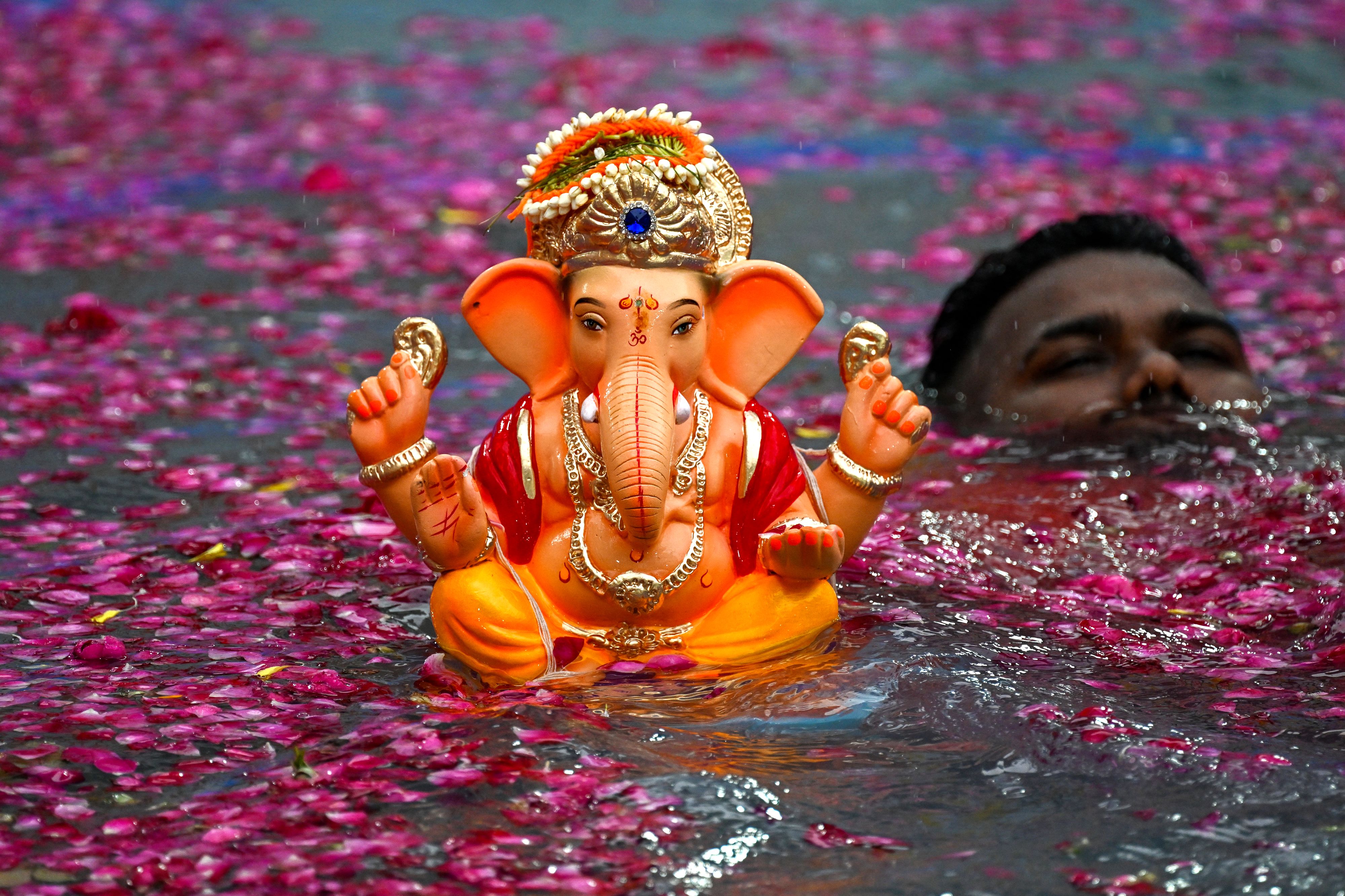 A volunteer carries an idol of the elephant-headed Hindu god Ganesha for immersion in an artificial pond during the ten-day Ganesh festival in Mumbai on September 20, 2023. (Photo by Punit Paranjpe/AFP Photo)