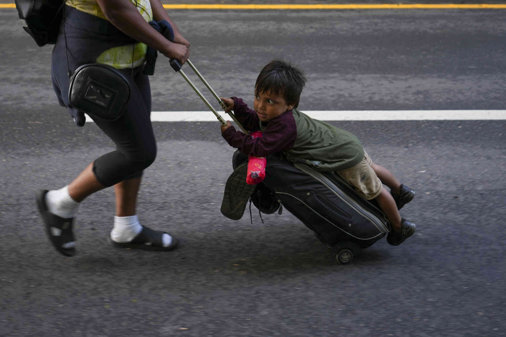 Nayely Nunez, from Honduras, uses her luggage to carry a child as she walks along the highway with a migrant caravan in Huixtla, southern Mexico, heading toward the country's northern border and ultimately the United States, Thursday, November 7, 2024. (Photo by Moises Castillo/AP Photo)