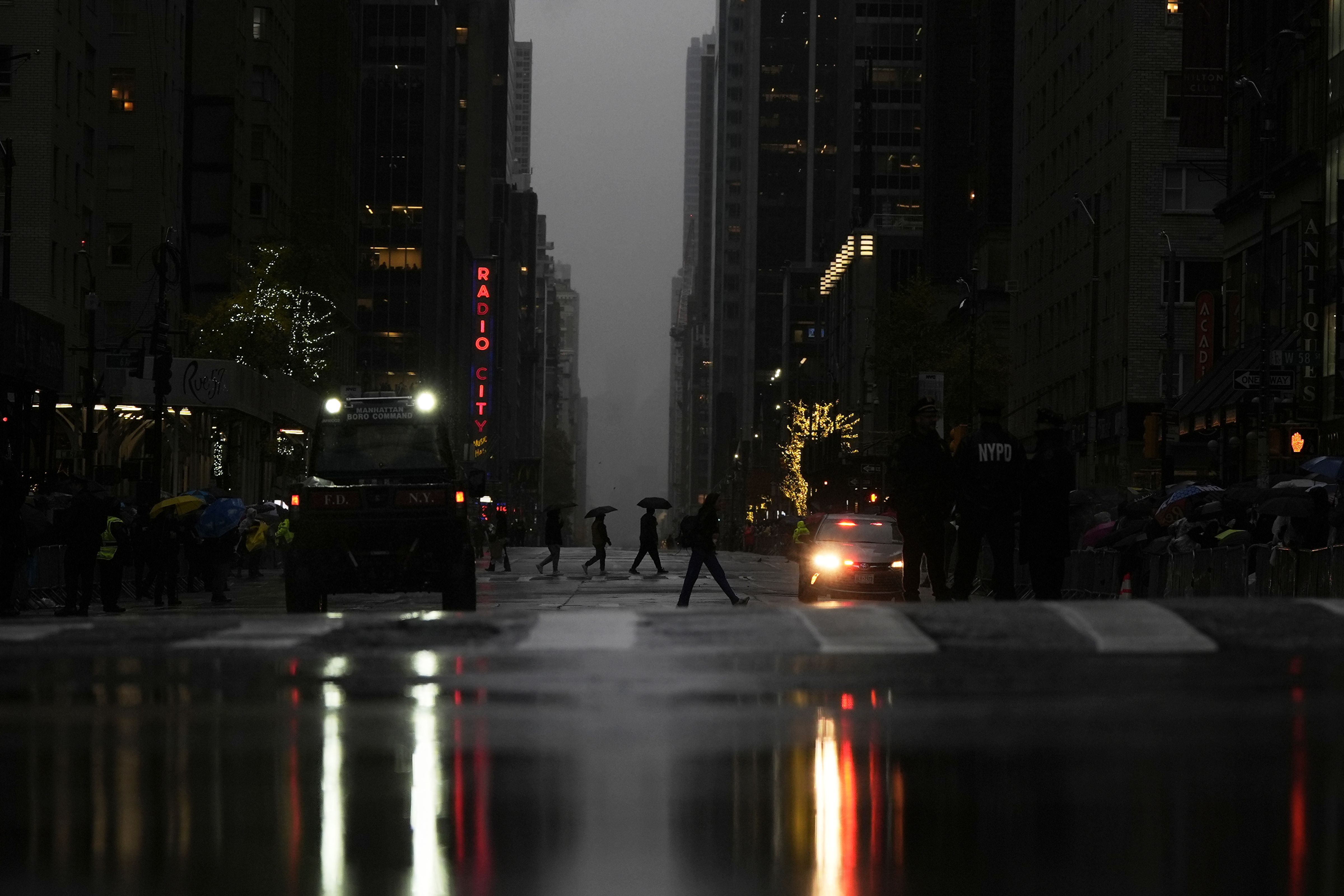 Pedestrians cross Sixth Avenue ahead of the start of the Macy's Thanksgiving Day Parade, Thursday, November 28, 2024, in New York. (Photo by Julia Demaree Nikhinson/AP Photo)