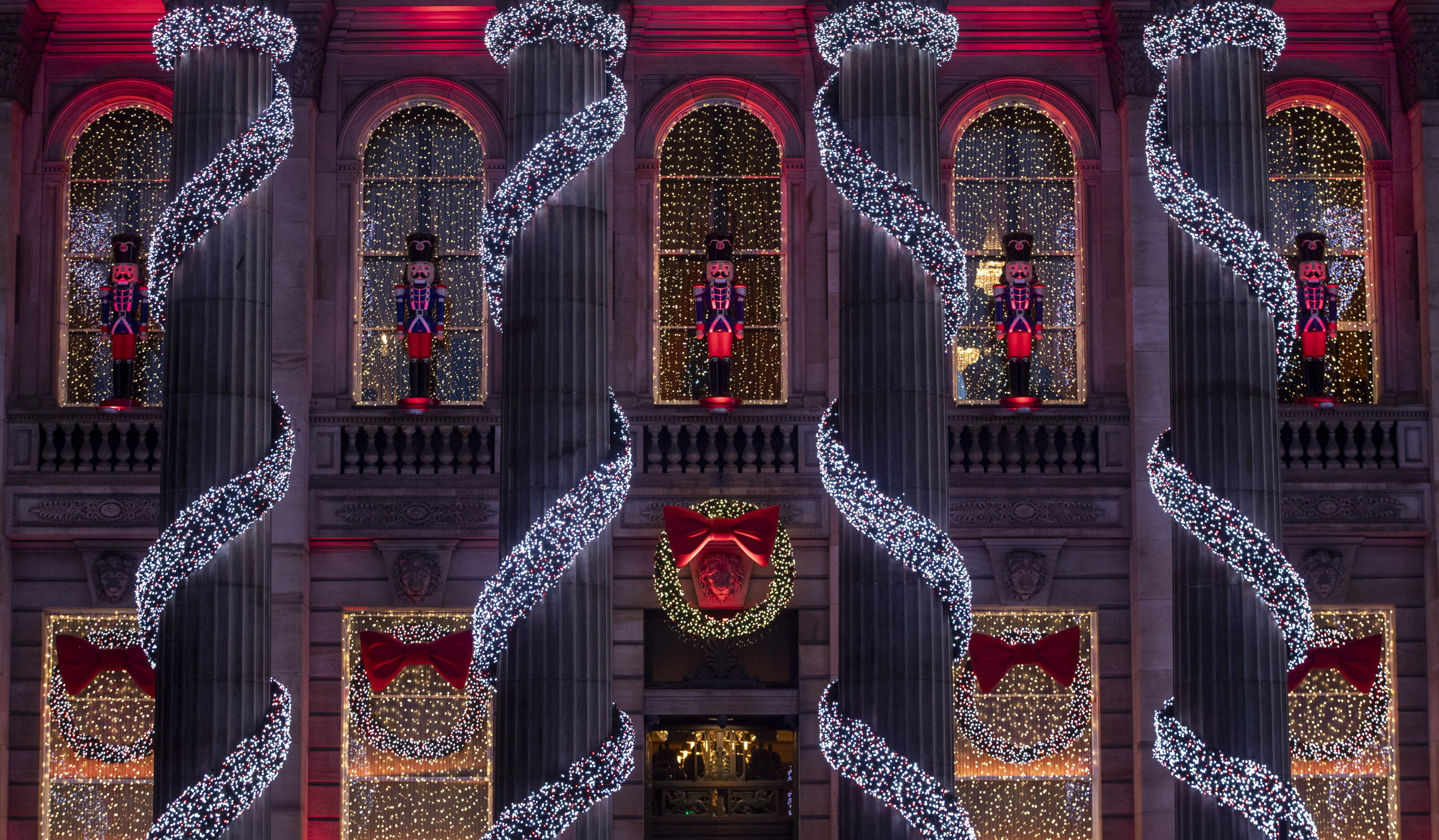 Christmas lights sparkling on an iconic Edinburgh landmark in Scotland on November 27, 2024. The Dome, on George Street, is a bar and restaurant inside a neo-classical building and former bank which dates from 1847. Hundreds of hours are spent deliberating as to how the Category A-listed building will be decorated as part of its annual Christmas tradition. Lights are wrapped around Corinthian columns, with wreaths and red bows hung inside arch windows. Nutcrackers are positioned on the balcony, and the inside of the building is also lit up. (Photo by Katielee Arrowsmith/South West News Service)