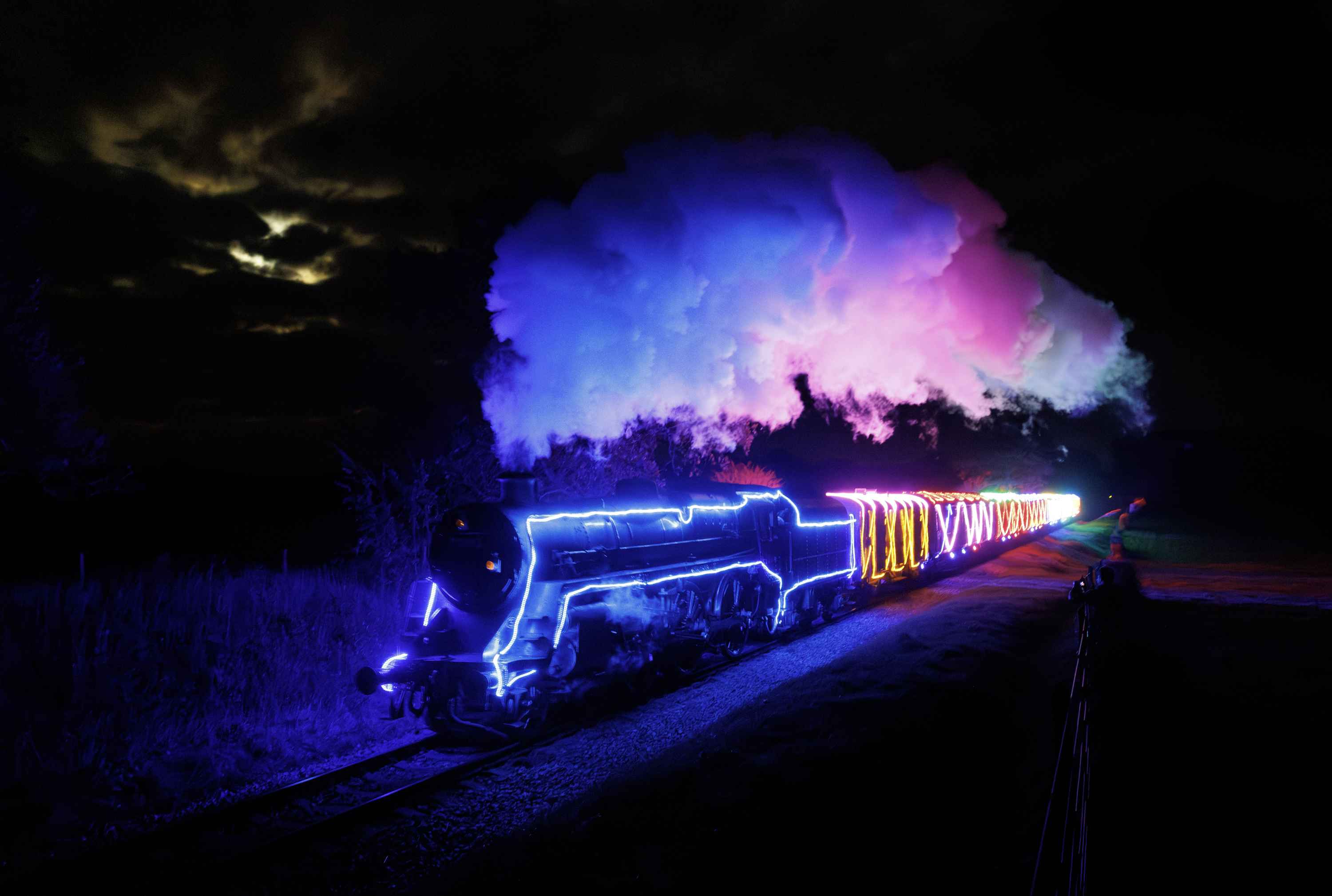 A British Railways Standard 5 steam locomotive decorated with thousands of Christmas lights heads to Horsted Keynes railway station on the Bluebell Line in West Sussex on November 17, 2024, as part of the SteamLights spectacular. (Photo by Peter Macdiarmid/London News Pictures)