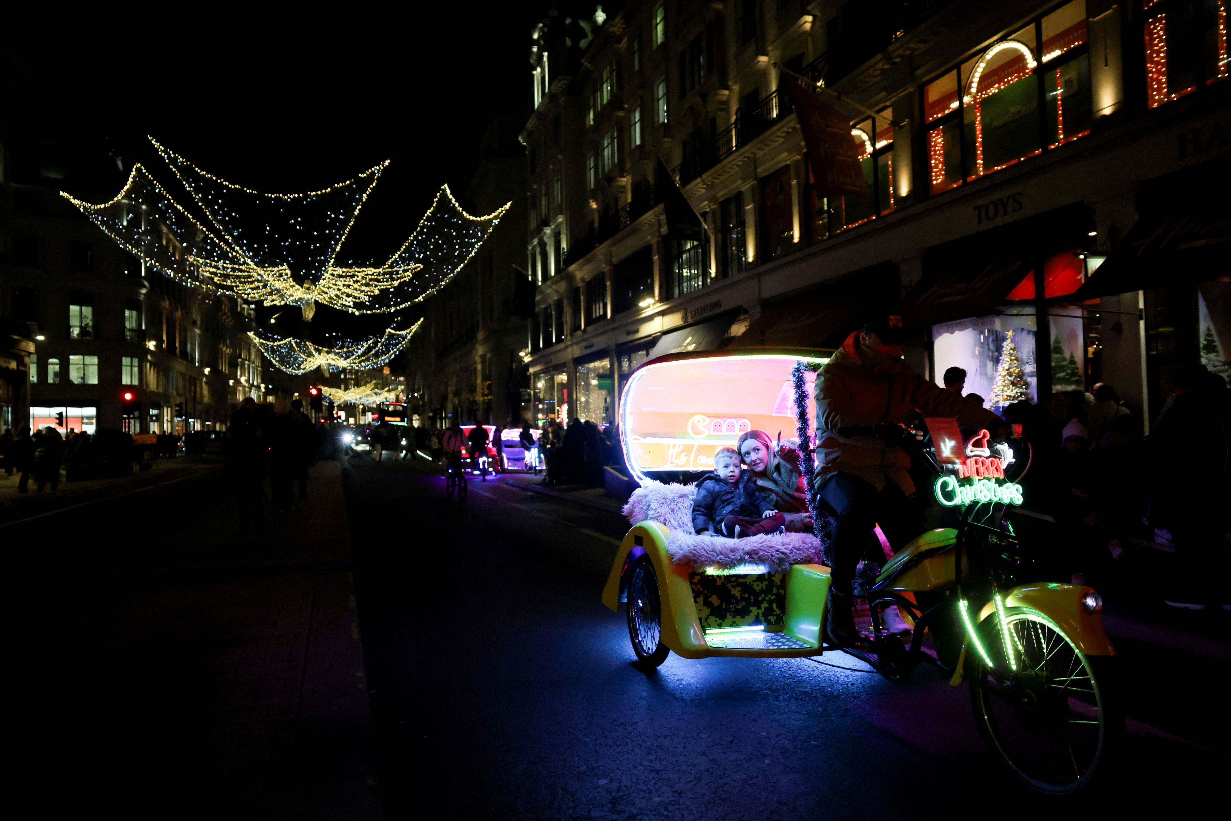 A woman and a child ride a cycle rickshaw through Regent Street, which is decorated with festive lights, in London, Britain on November 15, 2024. (Photo by Mina Kim/Reuters)