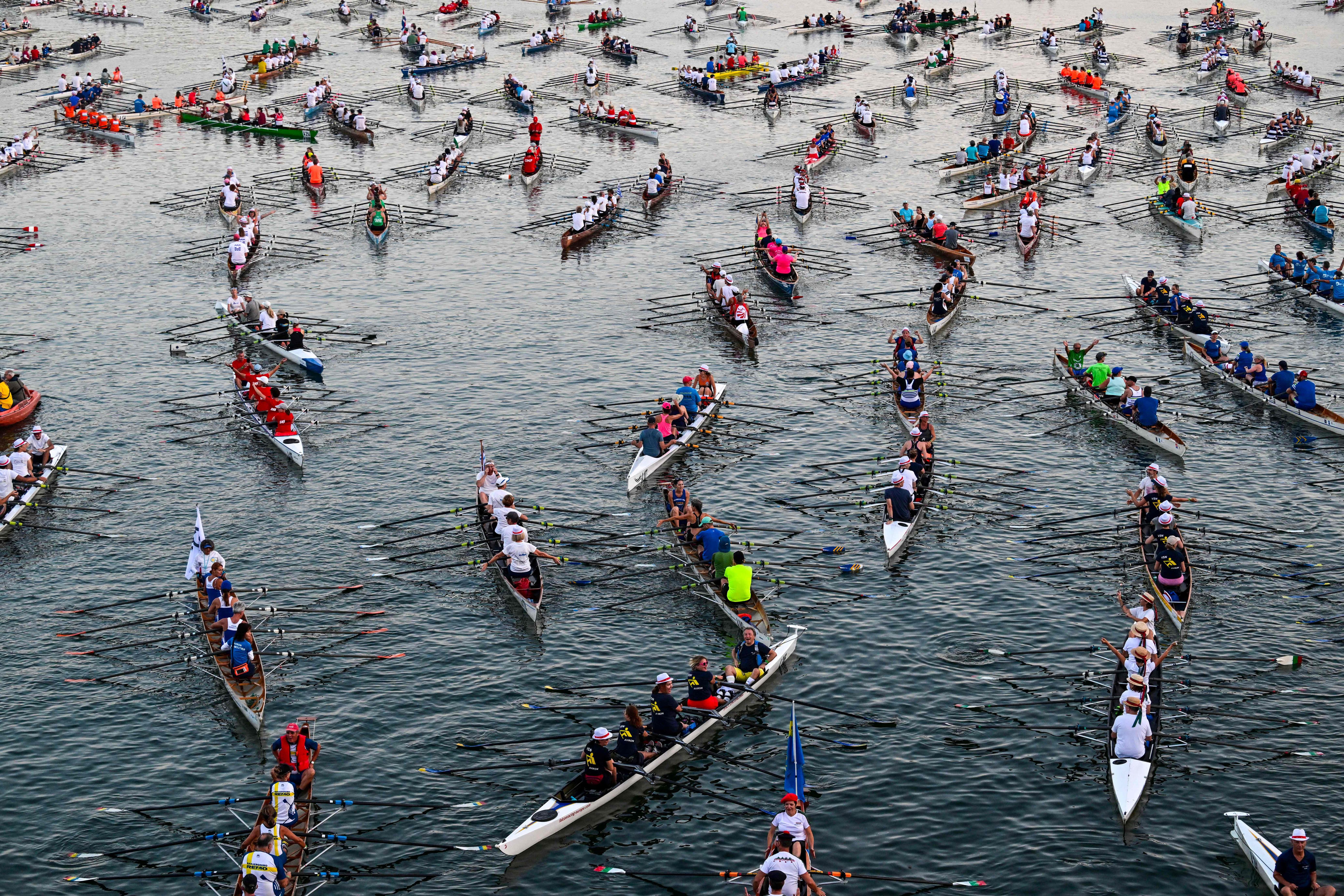 Rowers scull along the River Seine towards the Ile de la Cité, as they participate in the annual “La Traversee de Paris en Aviron” rowing event, that brings together more than 1000 rowers and 230 boats in Paris, on September 10, 2023. (Photo by Miguel Medina/AFP Photo)