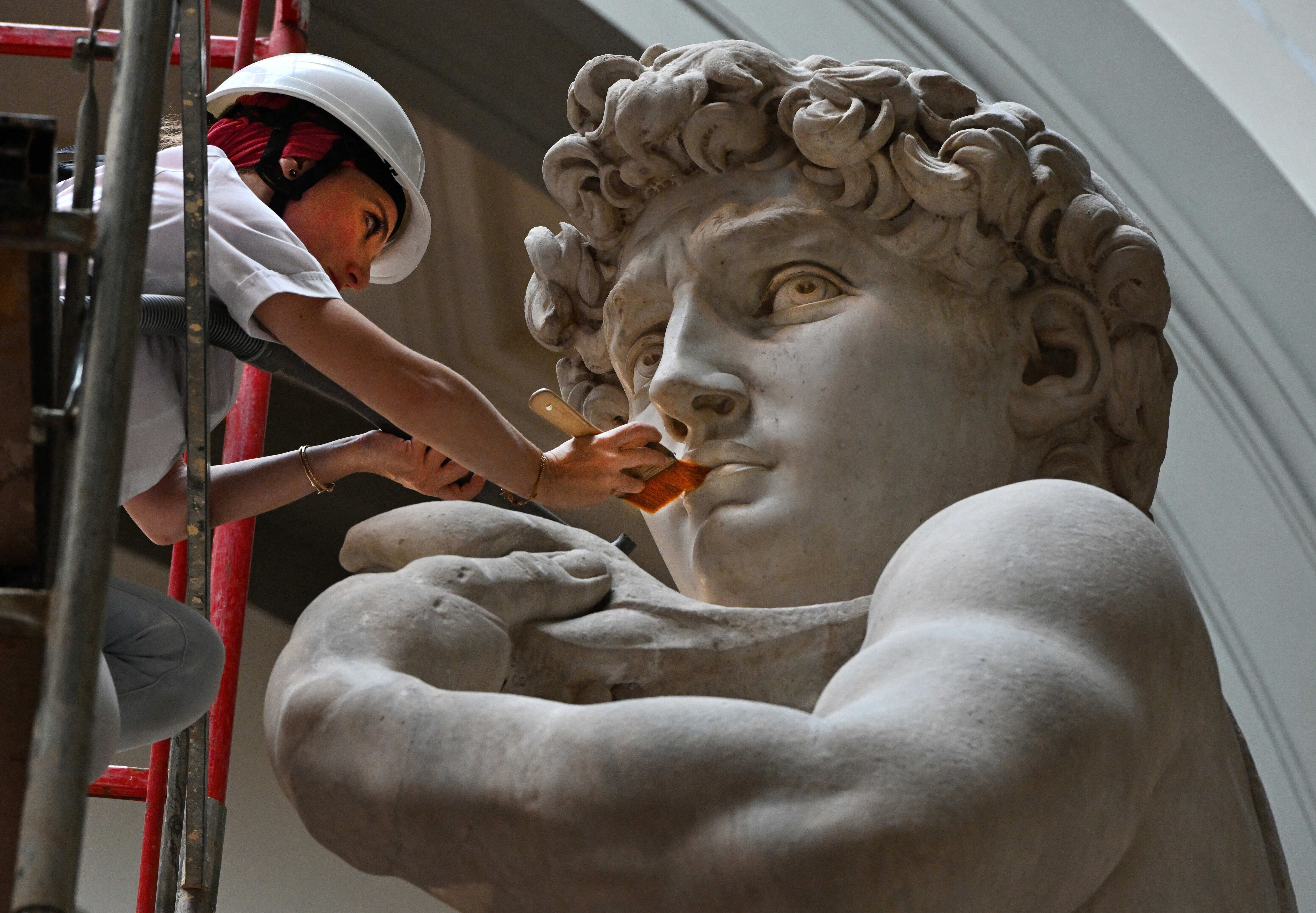 Italian Restorer Eleonora Pucci cleans dust and debris off Michelangelo's world-famous marble statue of David at the Galleria dell'Accademia in Florence, Italy on September 25, 2023. The restorer spends a day dusting off the 5.17-metre statue. The process takes place every two months. She uses a series of soft brushes and a low-pressure vacuum cleaner to ever so gently remove the dust and dirt deposits that inevitably occur when there are so many visitors flocking to see the masterworks. The statue was crafted by the Italian master between 1501-1504 from a block of marble. It represents the Biblical hero David, a favoured subject in the art of Florence. Originally the statue was placed in a public square, outside the Palazzo della Signoria, the seat of civic government in Florence, where it was unveiled on 8 September 1504. The statue was moved to the Galleria dell'Accademia, Florence, in 1873, to better protect it against pollution and the elements, and later replaced at the original location by a replica. By taking care of the David every two months, restorers are able to closely monitor the statues' condition and to record any changes to the surface of the marble. According to the Director of the Accademia the statue is in good condition and the micro-fractures in David's ankles and in the tree trunk behind his right leg are stable. (Photo by Vandeville Eric/ABACA Press/Rex Features/Shutterstock)