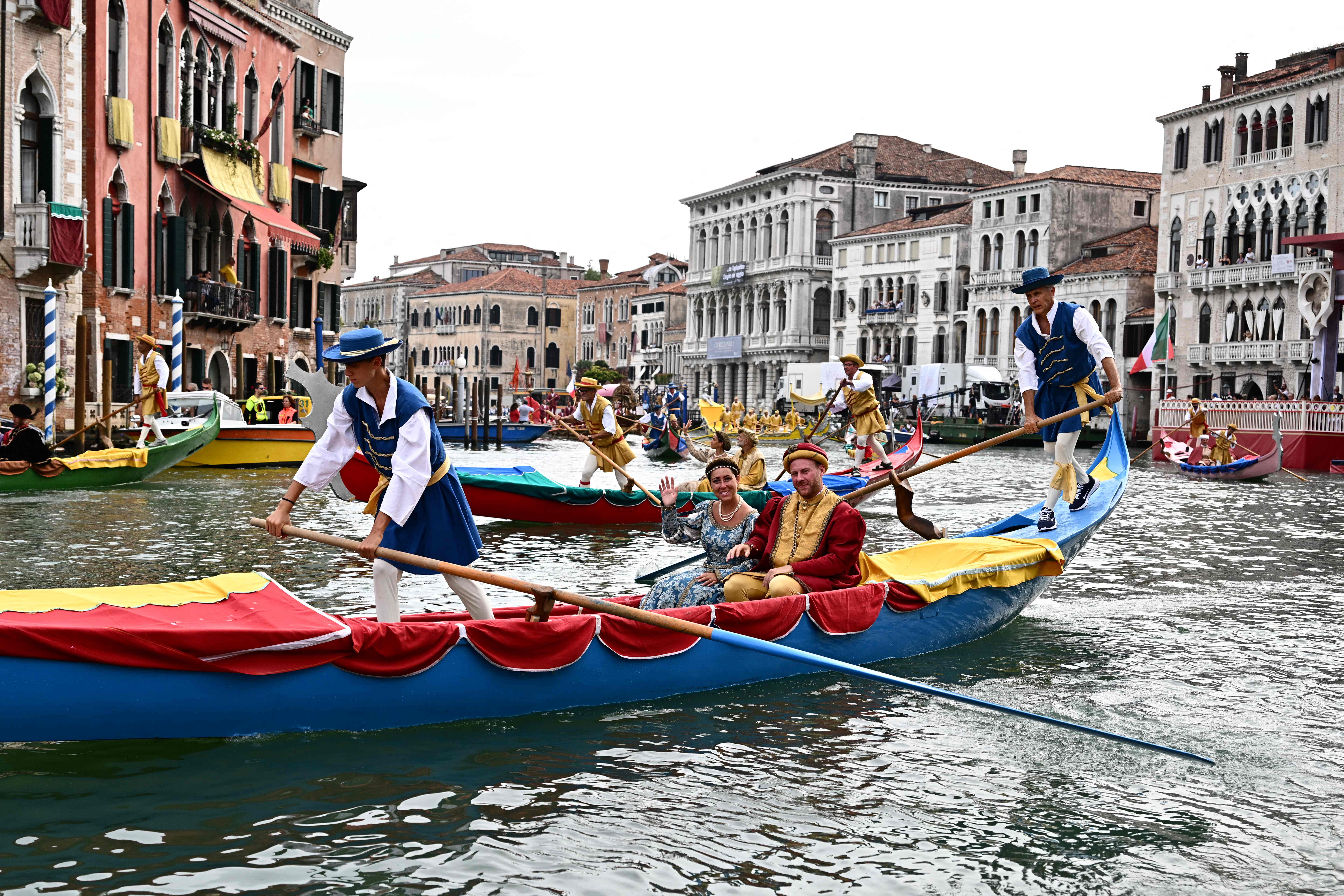 Rowers take part in the annual gondolas and boats Historical Regatta (Regata Storica) on the Grand Canal in Venice on September 3, 2023. (Photo by Gabriel Bouys/AFP Photo)