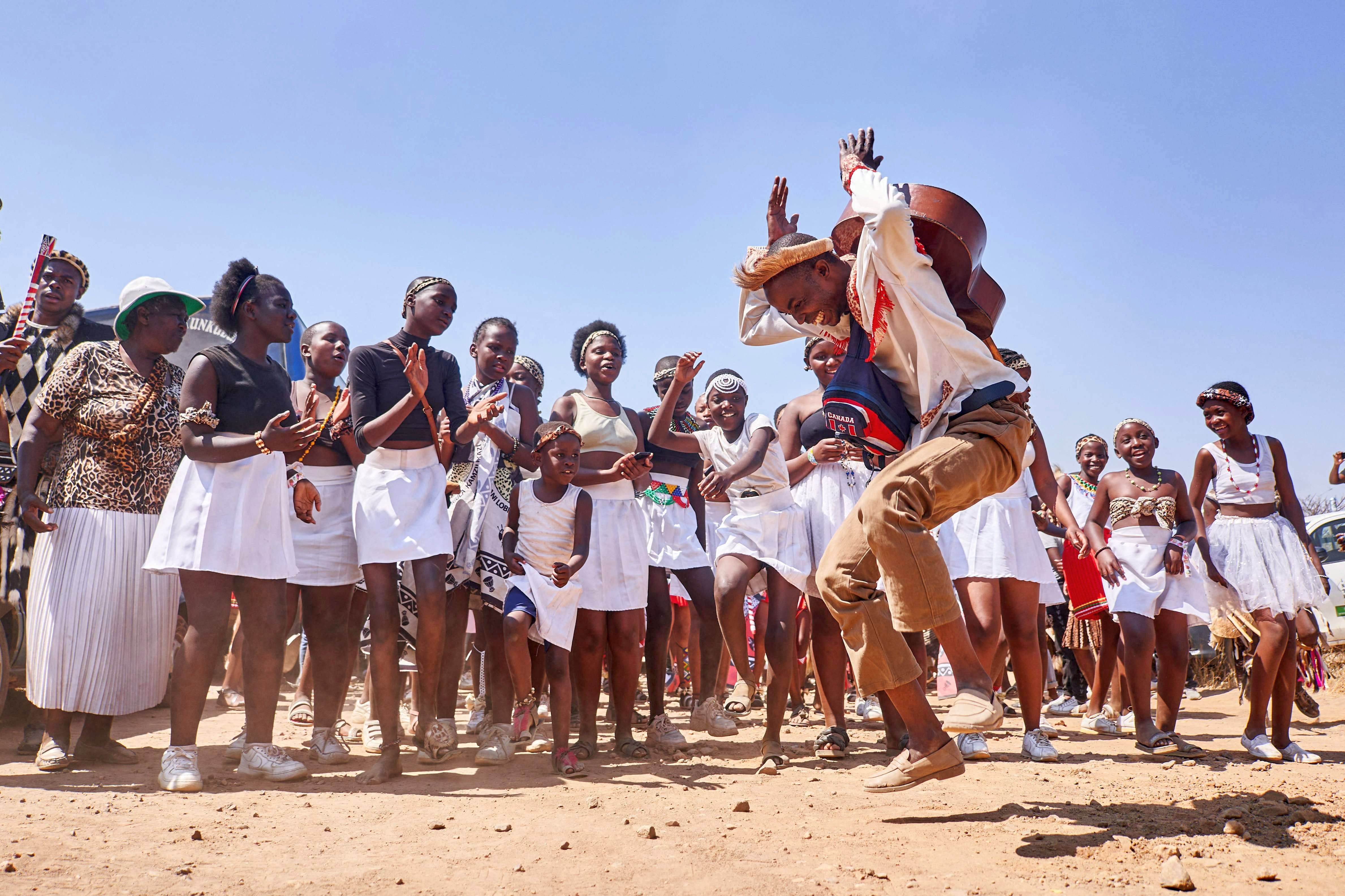 A musician dances with the lead maidens at the annual King Mzilikazi commemoration held on September 9, 2023 at a ruins 22km outside Bulawayo, Zimbabwe. Mzilikazi migrated from Zululand (South Africa) fleeing war and settled here in 1838. The Zimbabwe constitution recognises different cultures and traditions yet does not give legal recognition to a King as a traditional leader. In 2018 the state prohibited the coronation of Crown Prince - Bulelani Khumalo a decision which sparked several violent protests in Bulawayo. (Photo by Zinyange Auntony/AFP Photo)