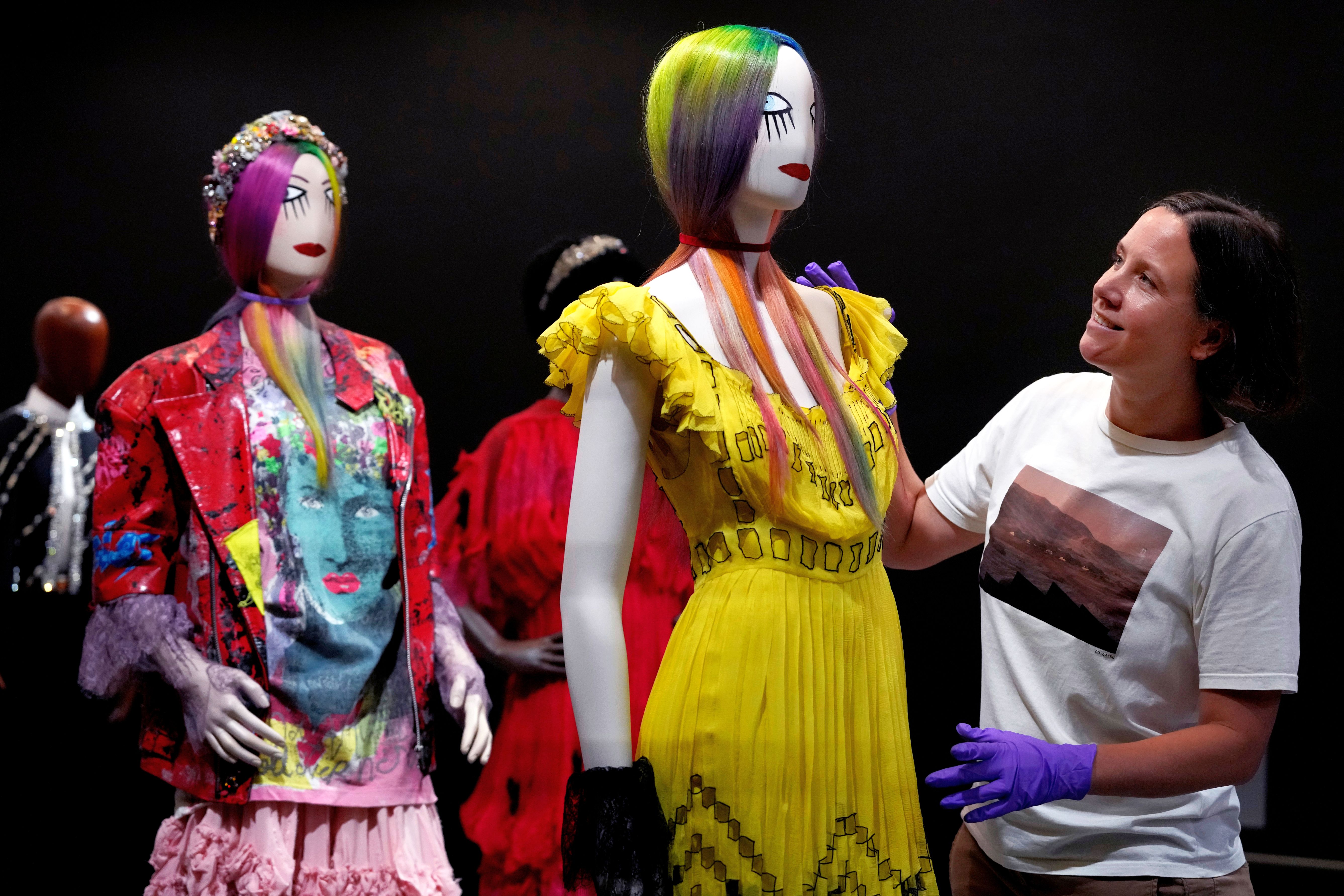 A Design Museum employee adjusts outfits part of a NEWGEN catwalk display on diplay at The Design Museum in London, Monday, September 11, 2023. Nearly 100 radical and trailblazing looks made or conceived in London are on show including Iconic outfits on display for the first time including Bjork's “swan” dress from the Oscars, Sam Smith's inflatable latex suit, and Harry Styles' outfit from his video for “Golden”. The exhibition opens to the public on Saturday Sept. 16. (Photo by Kirsty Wigglesworth/AP Photo)