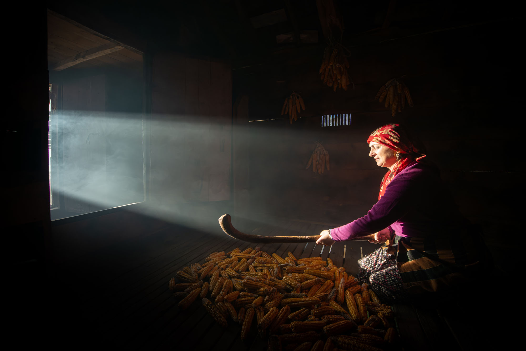 A woman works on the process of storing products, especially corn and pumpkin, for the winter season in the historical serenders in Trabzon's Tonya district, Turkiye on October 16, 2024. The serenders, which are generally built for the storage of food, are built high above the ground and protect the products from pests and wild animals. (Photo by Engin Ayyildiz/Anadolu via Getty Images)