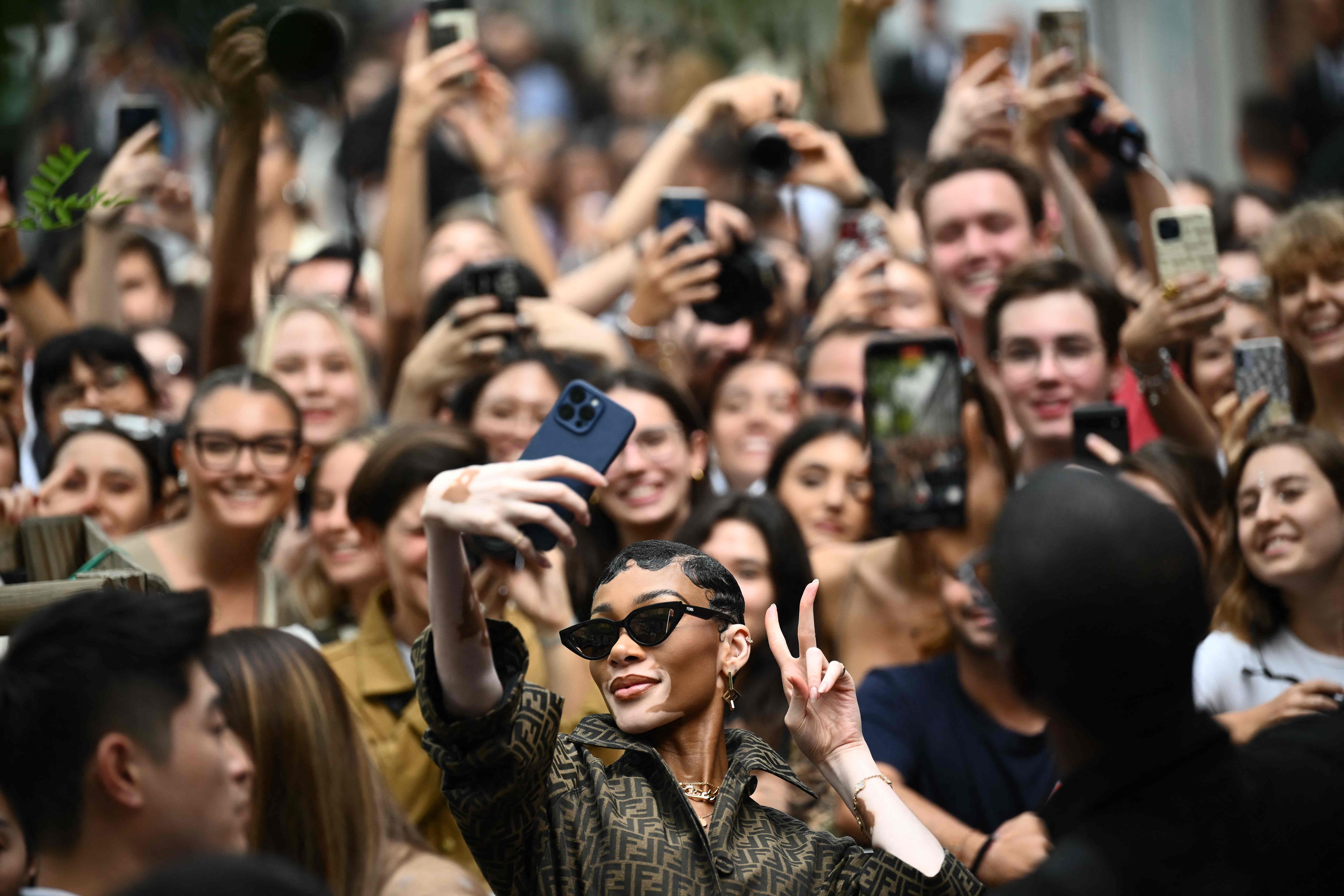 Canadian fashion model Winnie Harlow snaps a selfie as she leaves after the Fendi fashion show during the Milan Fashion Week Womenswear Spring/Summer 2024 on September 20, 2023 in Milan. (Photo by Marco Bertorello/AFP Photo)
