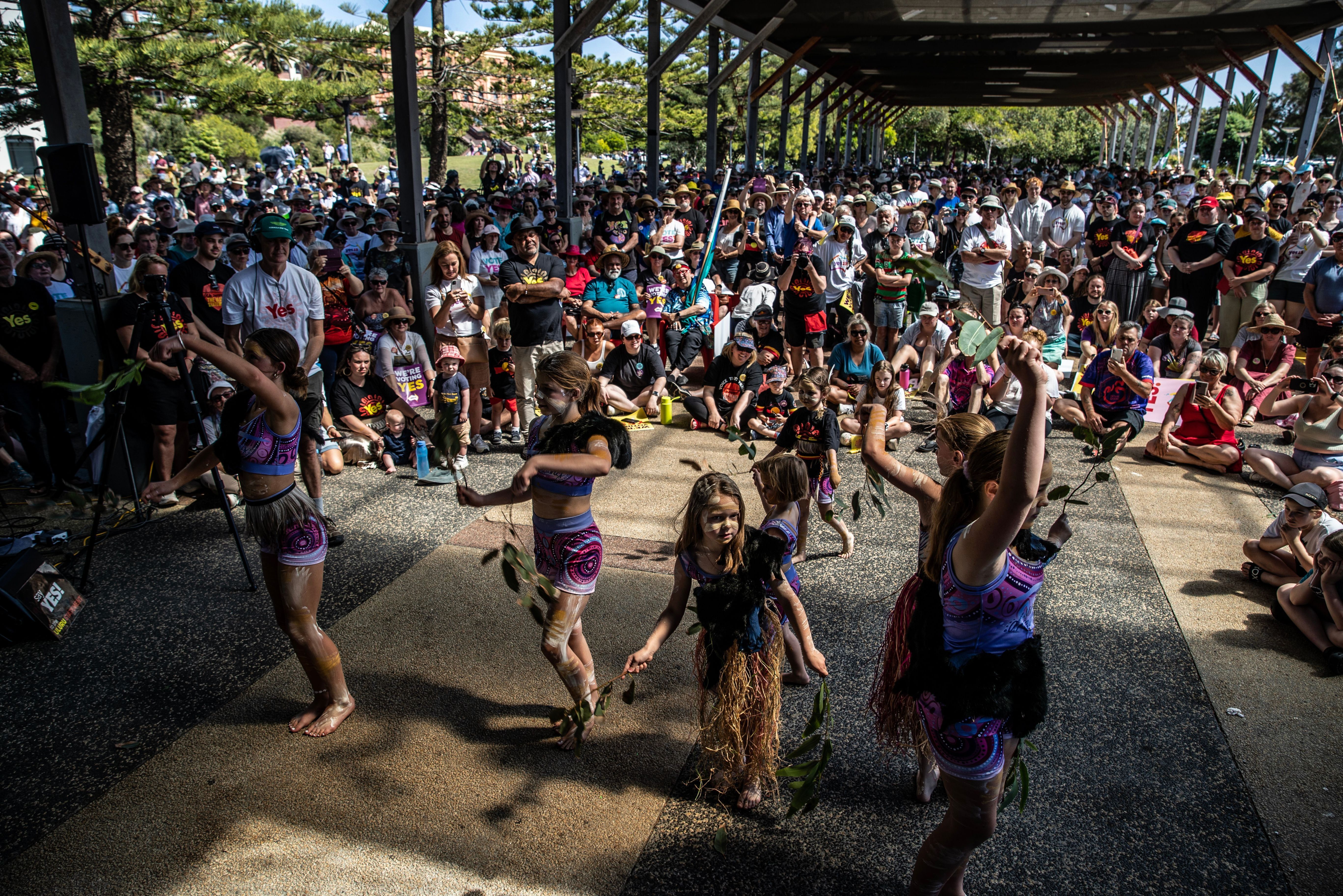 Local aboriginal dance group Midnight dreaming dancers perform a traditional dance during Walk for YES event at Foreshore Park on September 17, 2023 in Newcastle, Australia. On October 14, 2023, Australians will vote on a referendum to amend the Constitution to recognise First Peoples of Australia and establish an Aboriginal and Torres Strait Islander Voice to Parliament. To pass, the referendum requires a “double majority” – a national majority of “yes” votes, and a majority of states voting “yes”. (Photo by Roni Bintang/Getty Images)
