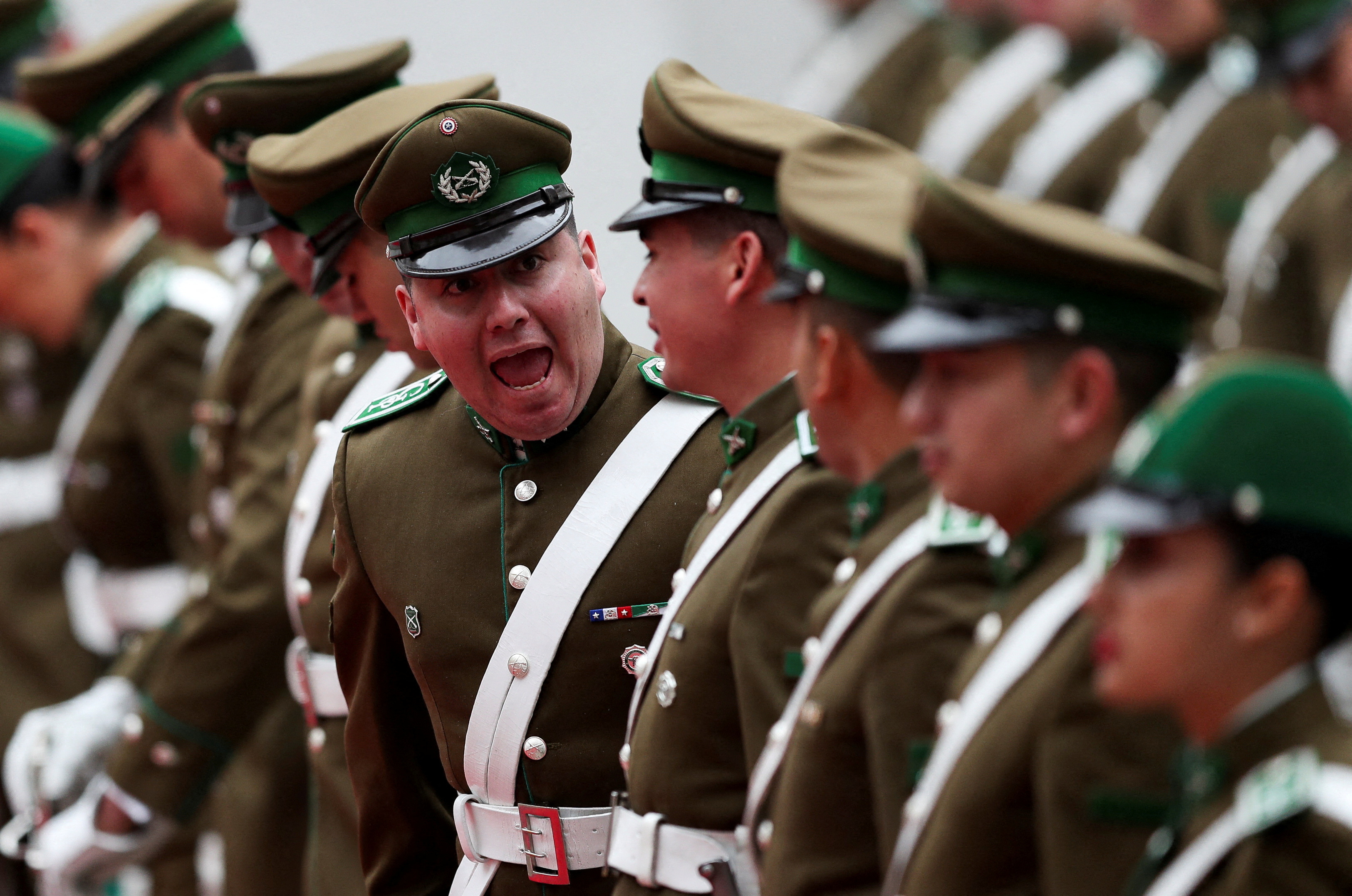 A police officer speaks ahead of Mexico's President Andres Manuel Lopez Obrador's arrival for a meeting with Chile's President Gabriel Boric at La Moneda government palace in Santiago, Chile on September 10, 2023. (Photo by Ivan Alvarado/Reuters)