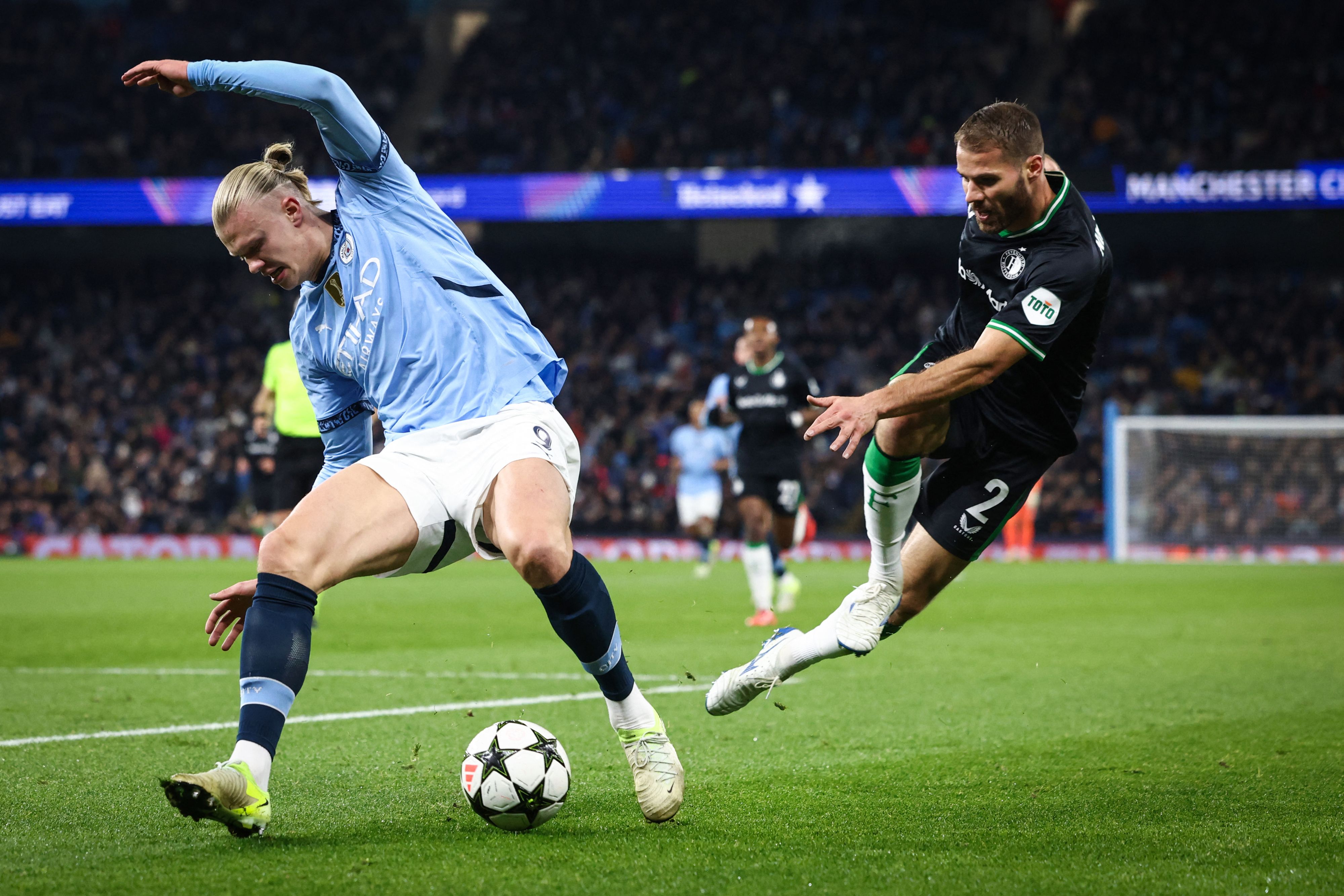 Manchester City's Norwegian striker #09 Erling Haaland (L) fights for the ball with Feyenoord's Dutch defender #02 Bart Nieuwkoop during the UEFA Champions League football match between Manchester City and Feyenoord at the Etihad Stadium in Manchester, north west England, on November 26, 2024. (Photo by Darren Staples/AFP Photo)