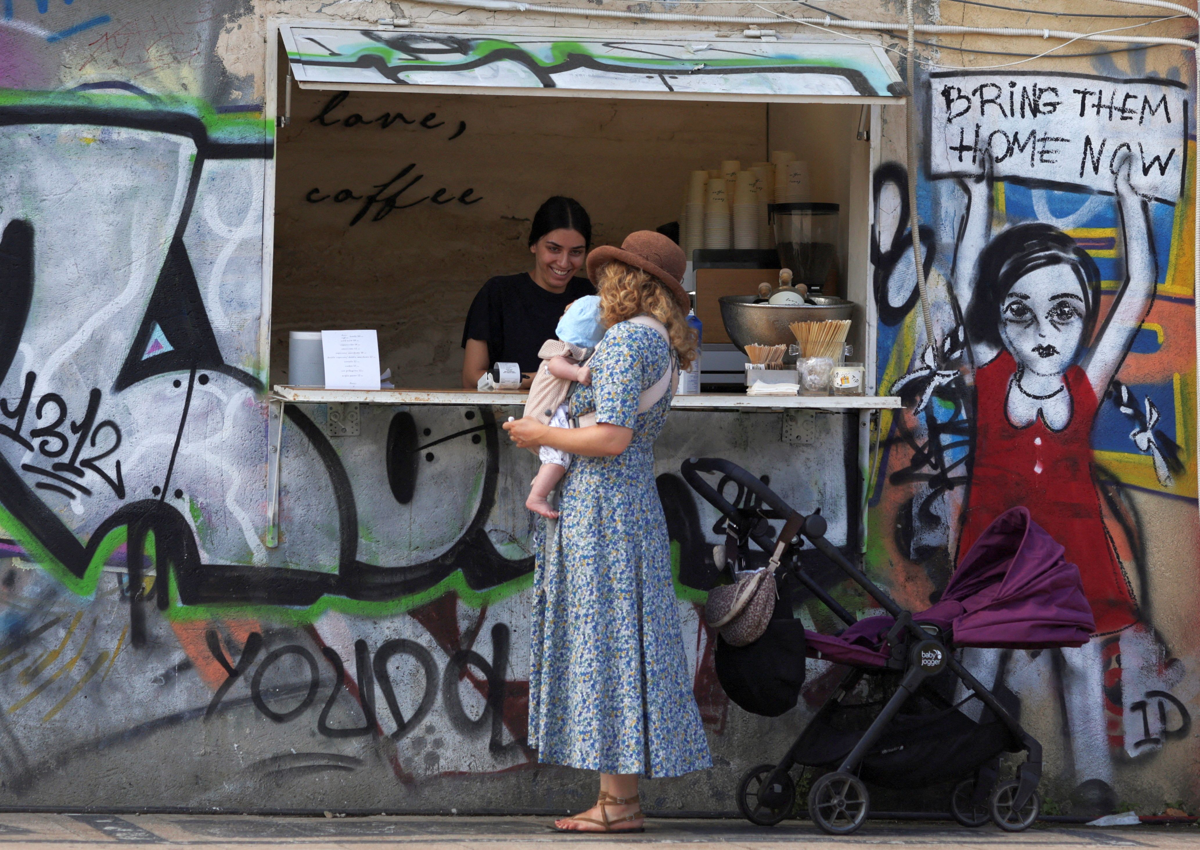 A woman carrying her baby stops by a coffeeshop, next to graffiti in support of hostages kidnapped during the deadly October 7 attack on Israel by Hamas, in Tel Aviv, Israel on July 18, 2024. (Photo by Ricardo Moraes/Reuters)