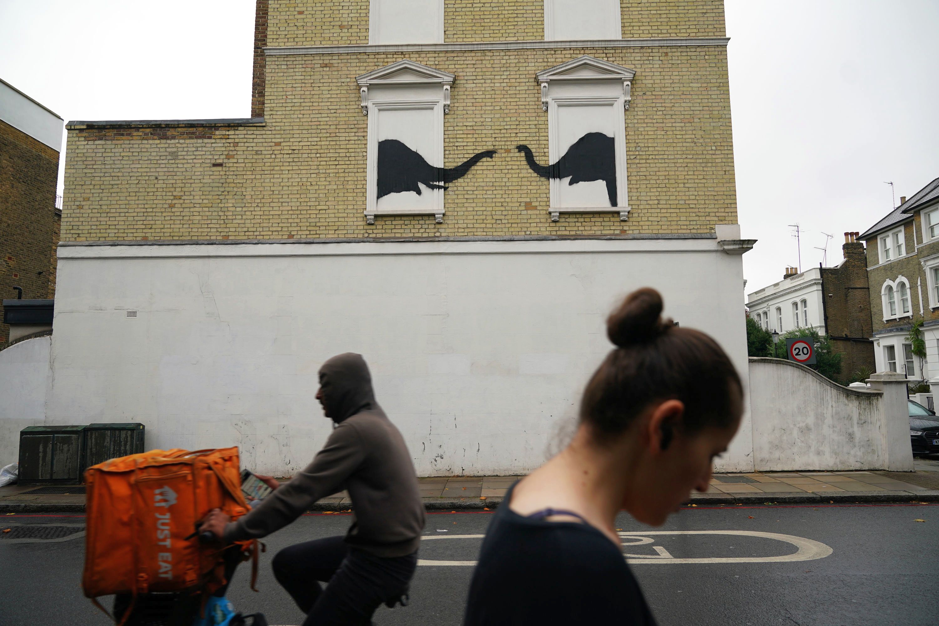 People pass a new artwork depicting two elephants poking their heads out of blocked out windows unveiled by Banksy on the side of a building at the junction of Edith Grove and Edith Terrace, in Chelsea, south west London on Tuesday, August 6, 2024. (Photo by Yui Mok/PA Images via Getty Images)