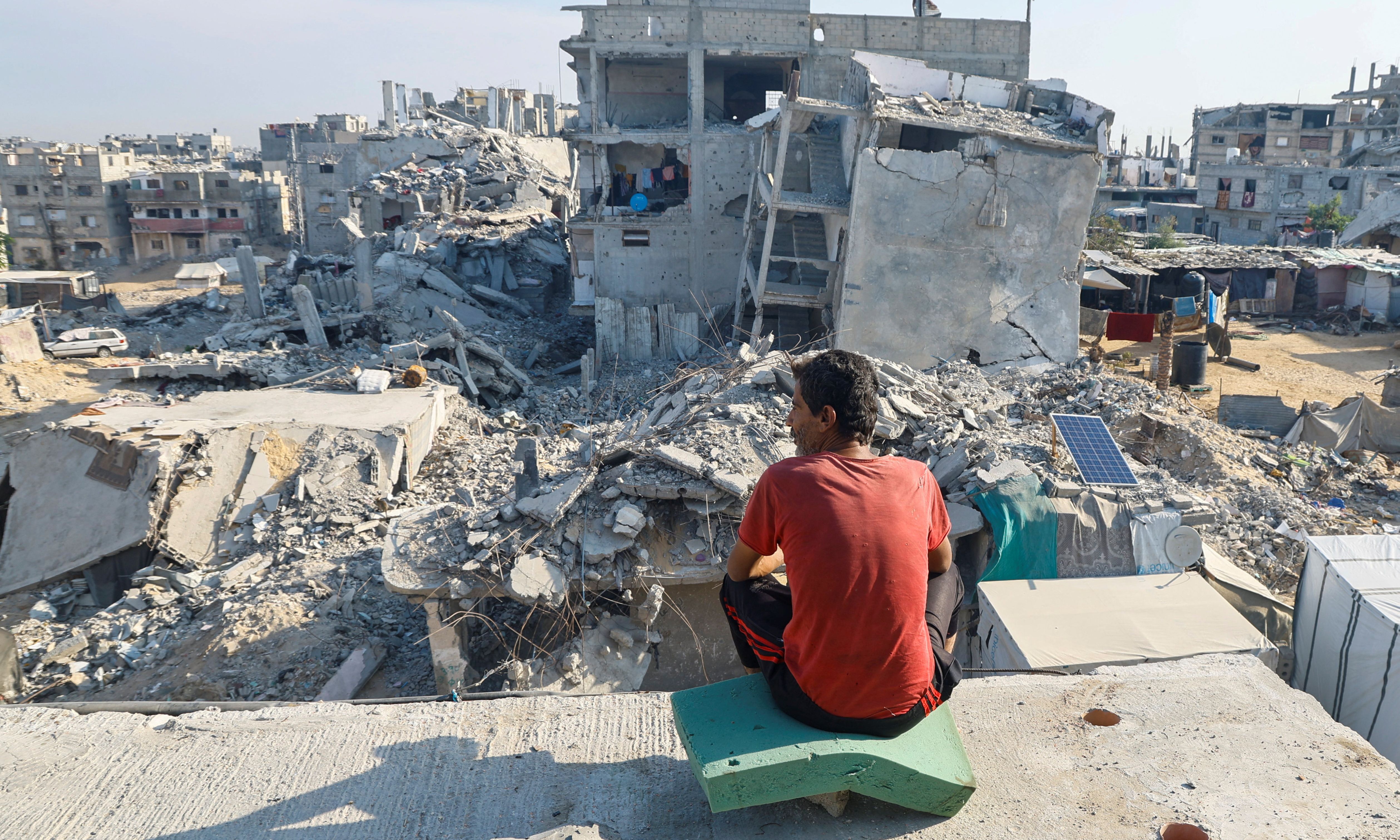 A Palestinian man sits on the rubble of a house destroyed in the Israeli military offensive, amid the Israel-Hamas conflict, in Khan Younis in the southern Gaza Strip, on November 4, 2024. (Photo by Mohammed Salem/Reuters)