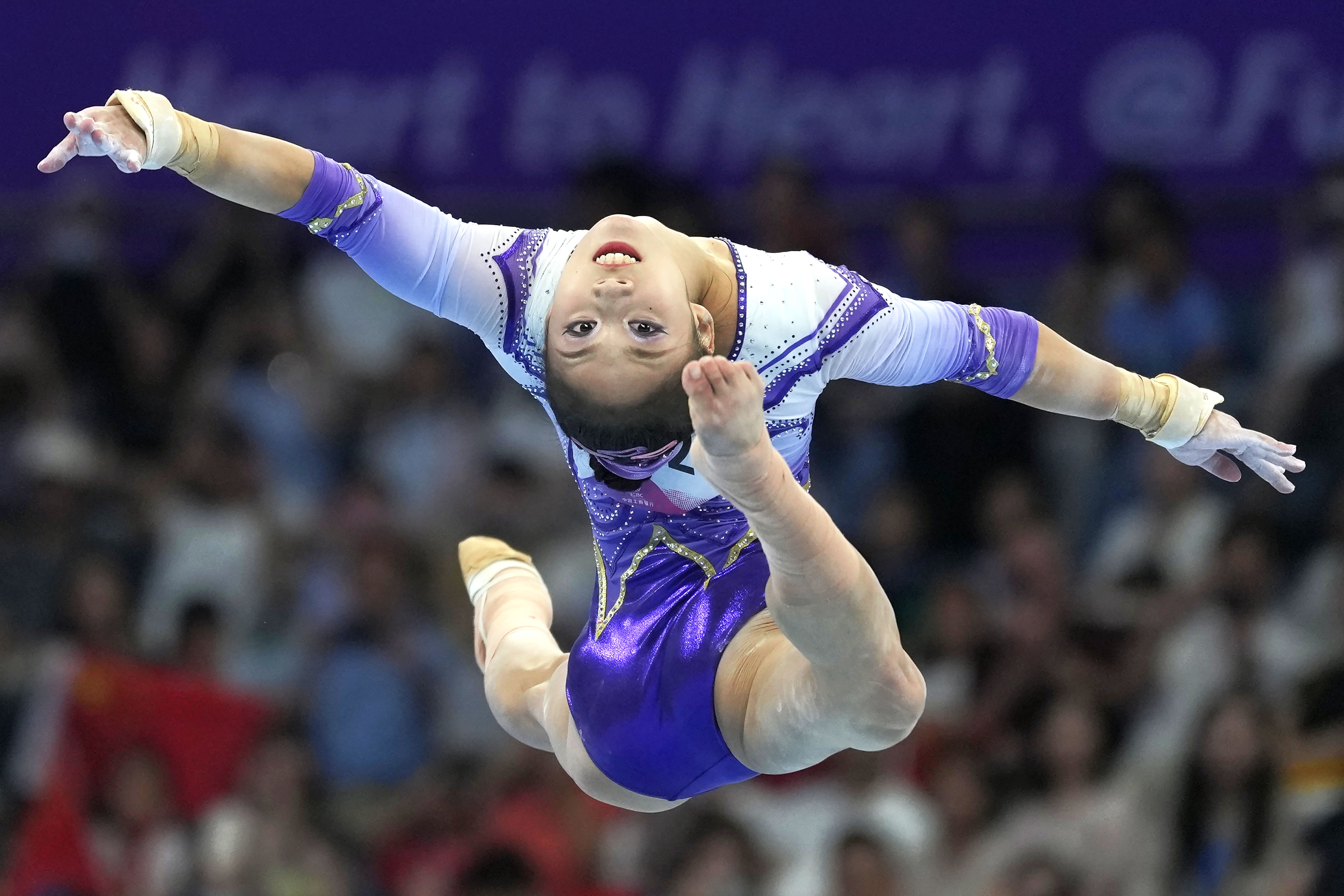 China's Zuo Tong competes in the floor exercise routine on her way to a gold medal for the Artistic Gymnastics Women's All-Around final competition of the 19th Asian Games in Hangzhou, China, Wednesday, September 27, 2023. (Photo by Ng Han Guan/AP Photo)