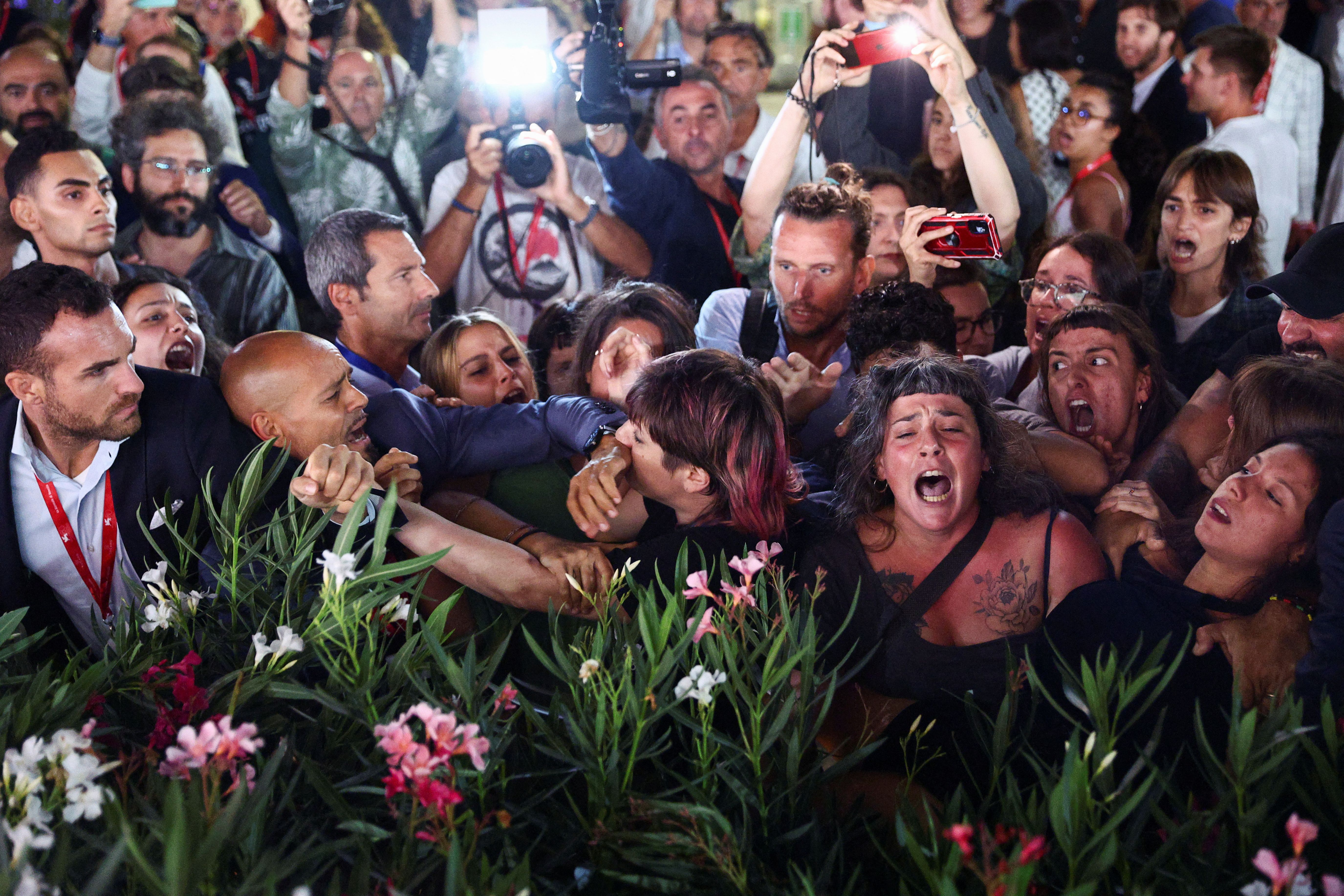 Scuffles break out at the Venice Film Festival at the premiere of Woody Allen’s movie “Coup de Chance” as protesters attempt to move on to the red carpet in Venice, Italy on September 4, 2023. (Photo by Guglielmo Mangiapane/Reuters)