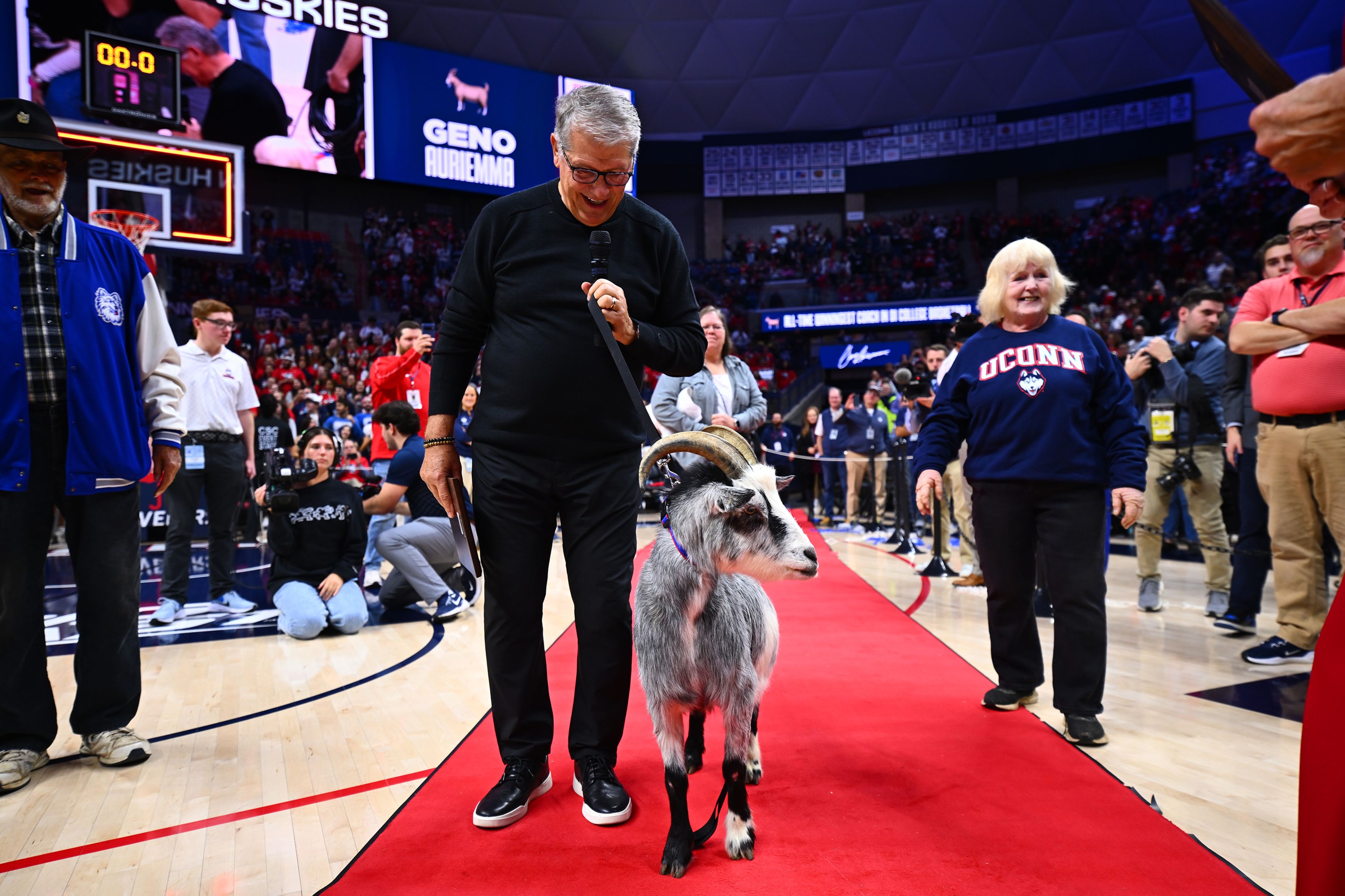 Geno Auriemma, the head coach of the University of Connecticut’s women’s basketball team, walks a red carpet with a goat after he became college basketball’s all-time winningest coach on Wednesday, November 20, 2024. (Photo by Austin Bigoney/UConn Athletics)