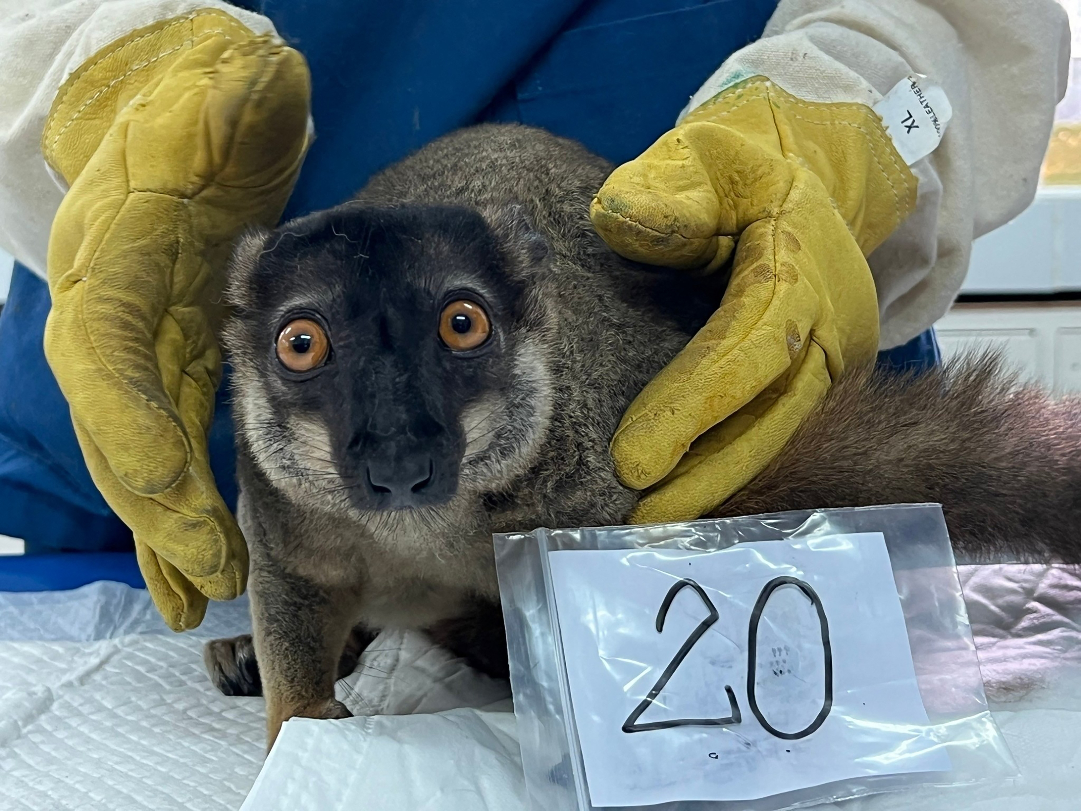 This undated handout photo released on November 27, 2024 by Thailand's Ministry of Natural Resources and Environment shows a brown lemur that was seized in an anti-trafficking operation being registered by a wildlife official at a facility in the Thai province of Chonburi. Thailand is sending almost 1,000 highly endangered lemurs and tortoises back to their home in Madagascar, in what both countries called the biggest ever operation against wildlife trafficking. (Photo by Handout/Thailand's Ministry of Natural Resources and Environment/AFP Photo)