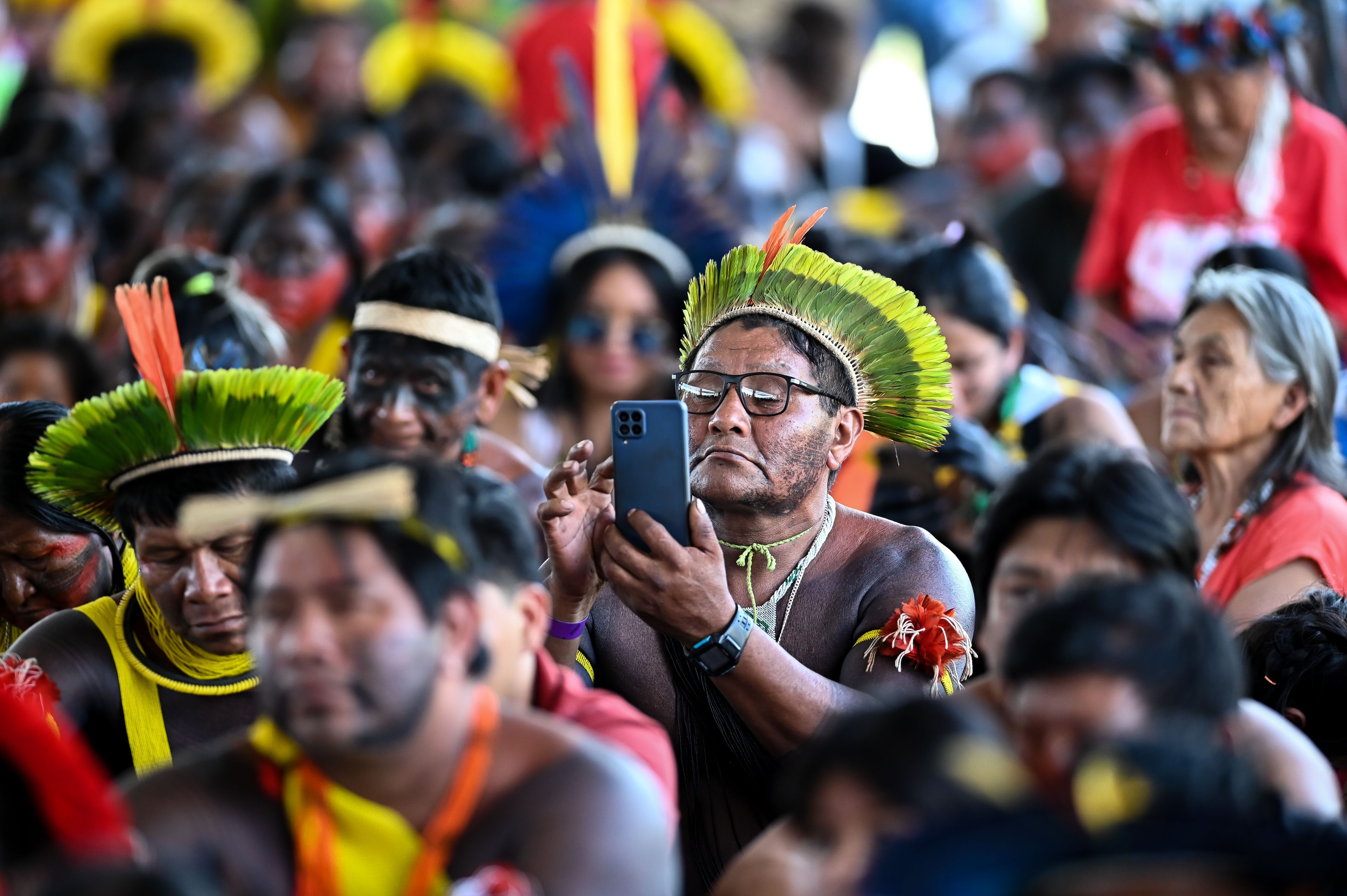 Indigenous people watch the broadcast of the “Temporal Milestone” trial in front of the Supreme Court in Brasilia, Brazil on September 20, 2023. The Supreme Court justices resumed their trial on the demarcation of indigenous lands and the constitutionality of laws protecting their lands before the enactment of the current Constitution. (Photo by Ton Molina/NurPhoto/Rex Features/Shutterstock)