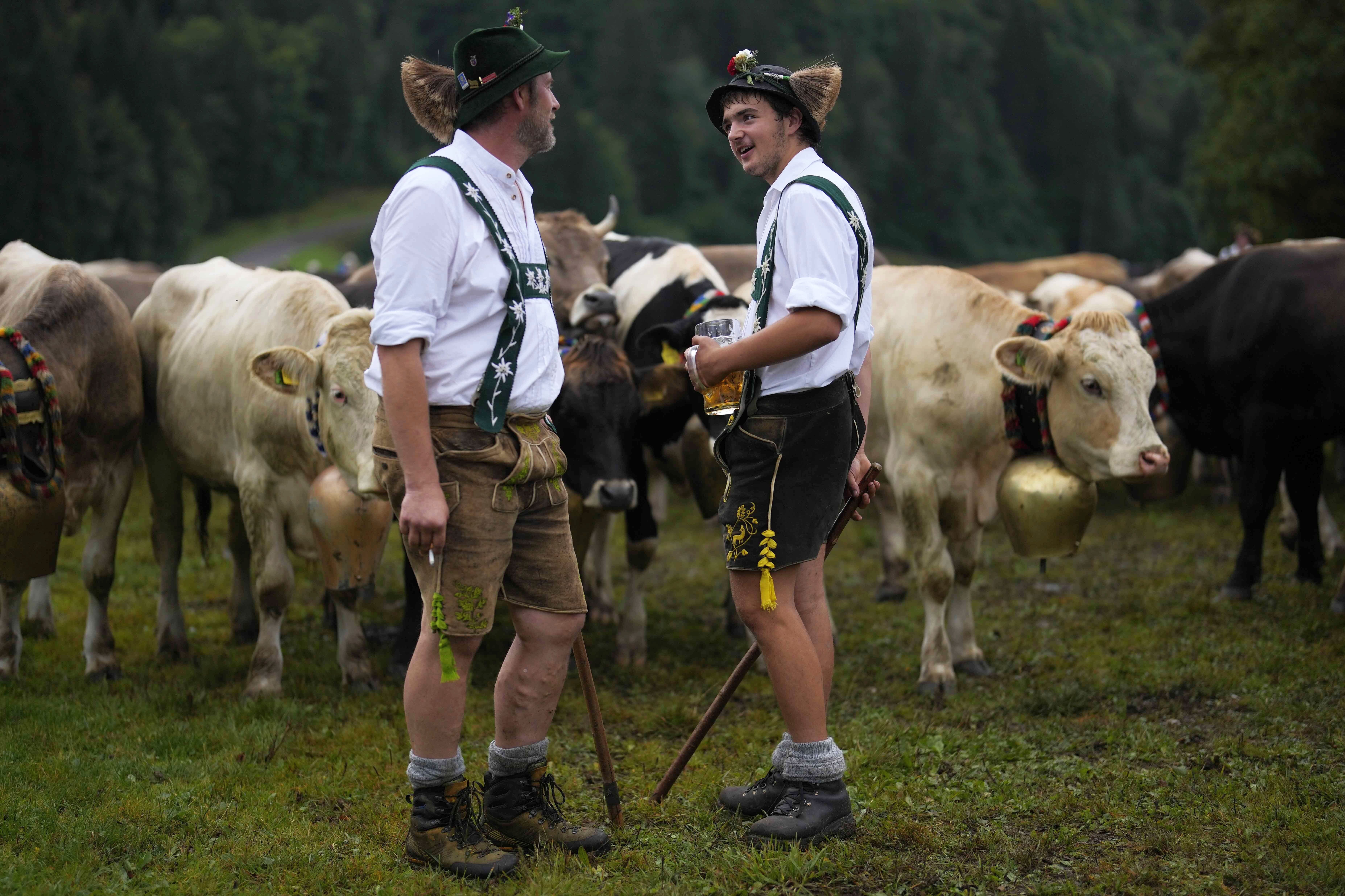 Bavarian herdsmen talk after driving their beasts during the return of the cattle from the summer pastures in the mountains near Oberstdorf, Germany, Wednesday, September 13, 2023. In autumn, herds fed on alpine pastures in the mountains during summer, are led down to the valley where they spend the winter. (Photo by Matthias Schrader/AP Photo)