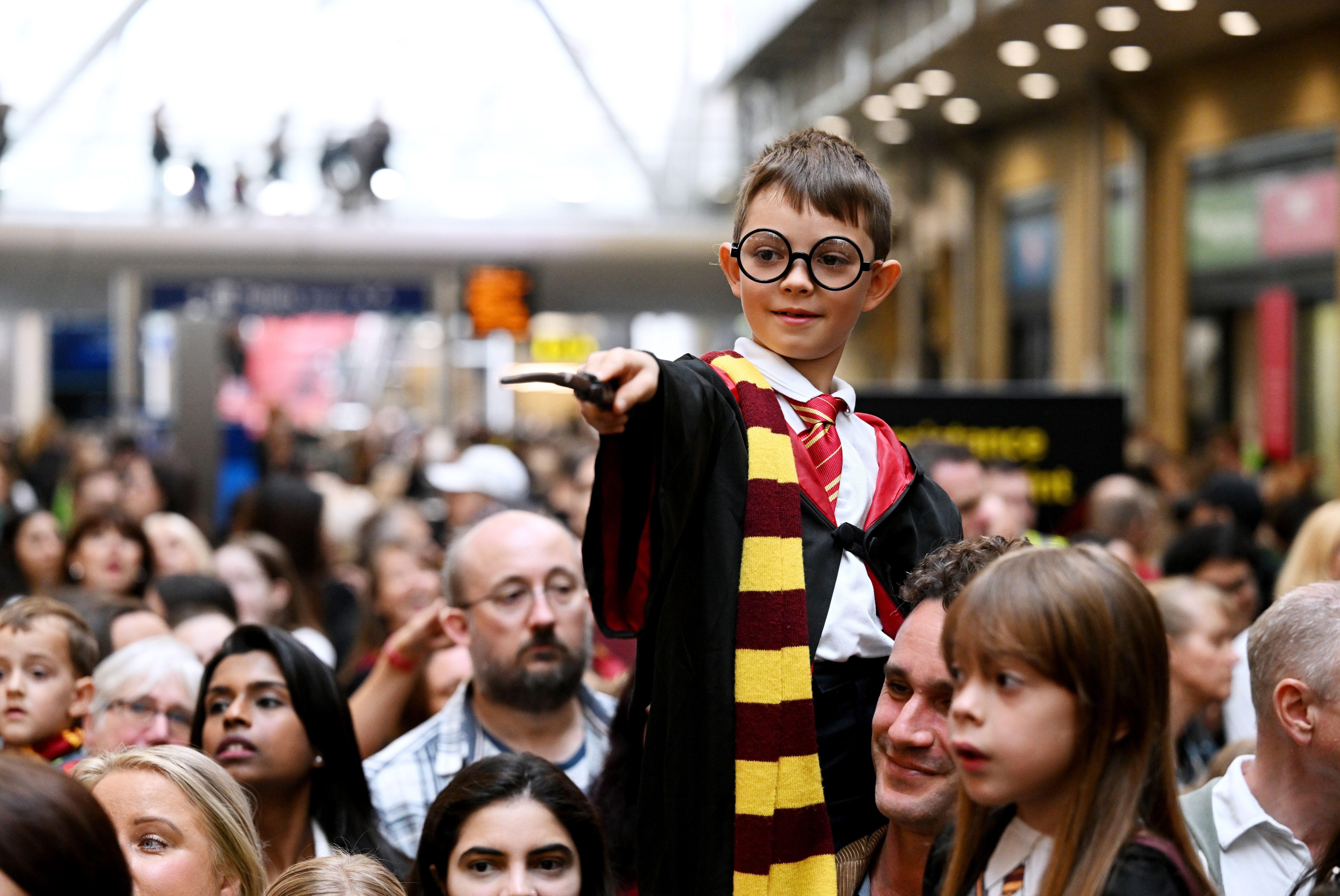 Harry Potter fans await the moment the Hogwarts Express departs from platform 9 3/4 at Kings' Cross station in London, UK on September 1, 2023. (Photo by James Veysey/Rex Features/Shutterstock)