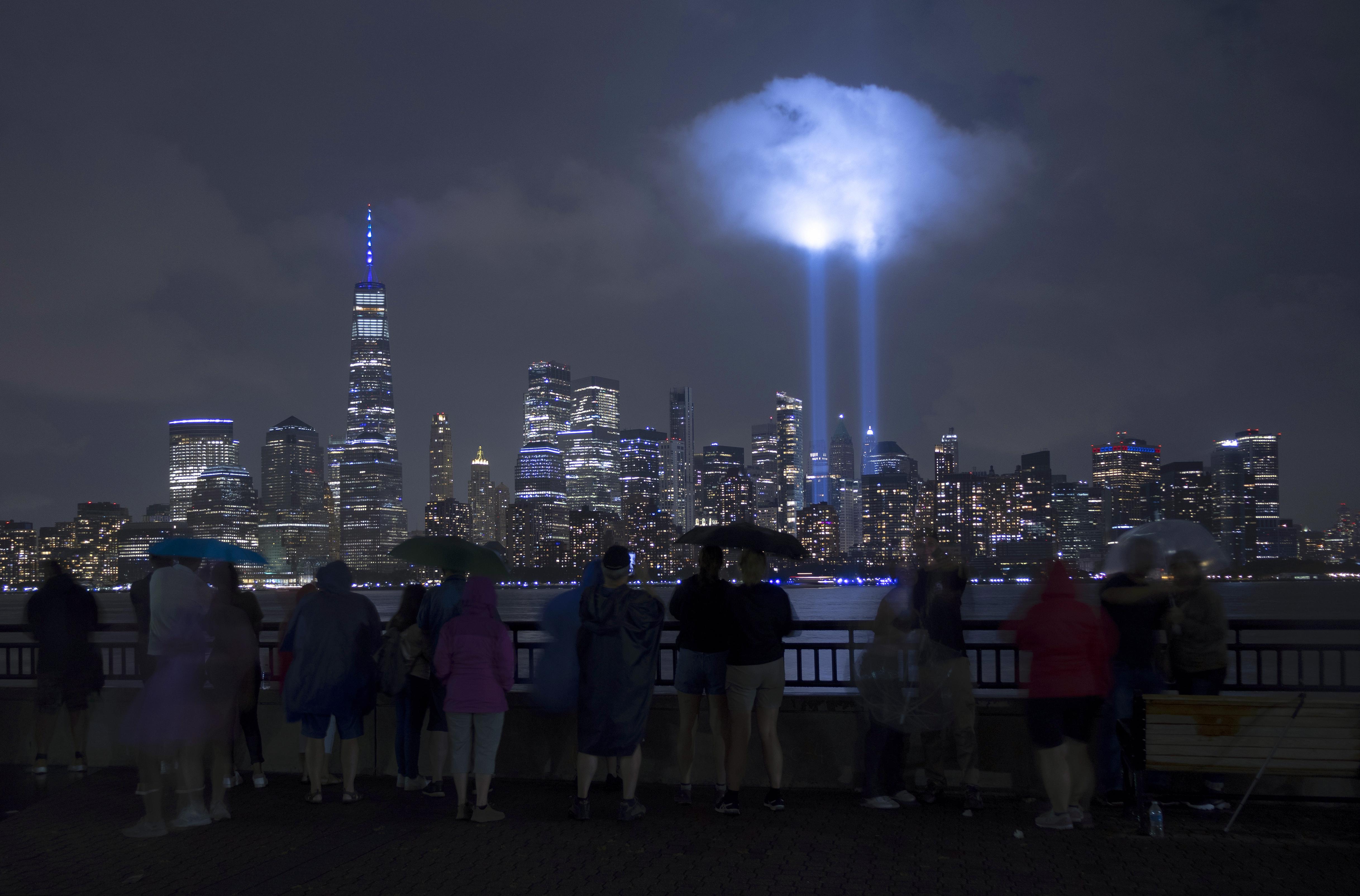 The annual Tribute in Light is illuminated above the skyline of lower Manhattan, and One World Trade Center as it is set up to mark the 22nd anniversary of the 9/11 attacks in New York City on September 10, 2023, as seen from Jersey City, New Jersey. (Photo by Gary Hershorn/Getty Images)