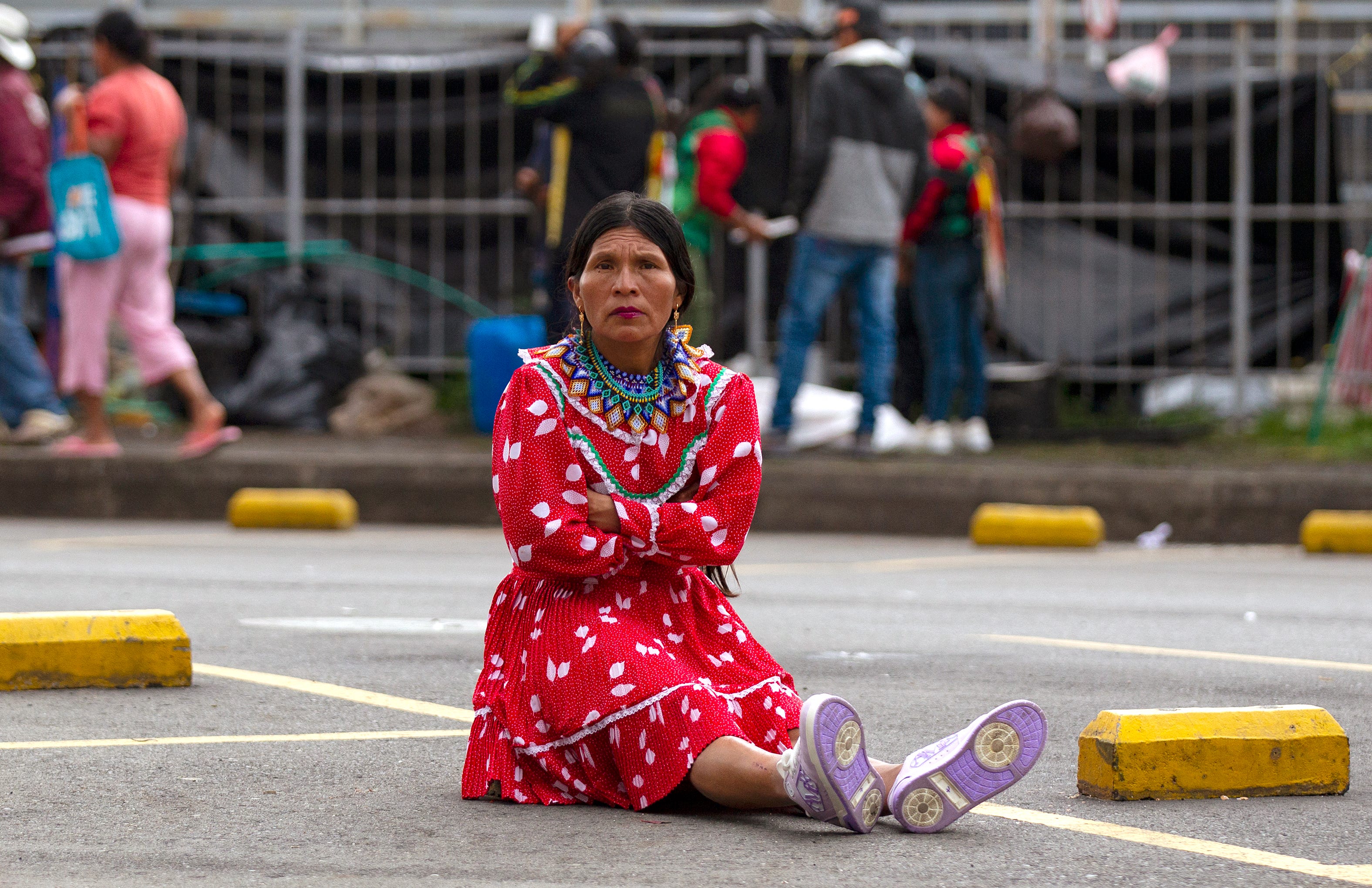 An Embera indigenous sits on the parking lot of the National Lands Agency during a protest in Bogota on November 26, 2024. Around 2,000 indigenous people from northwestern Colombia are camping outside a government office in Bogota since November 25, demanding a meeting with senior officials to discuss their rights on ancestral lands and care for their communities. (Photo by Alejandro Martinez/AFP Photo)