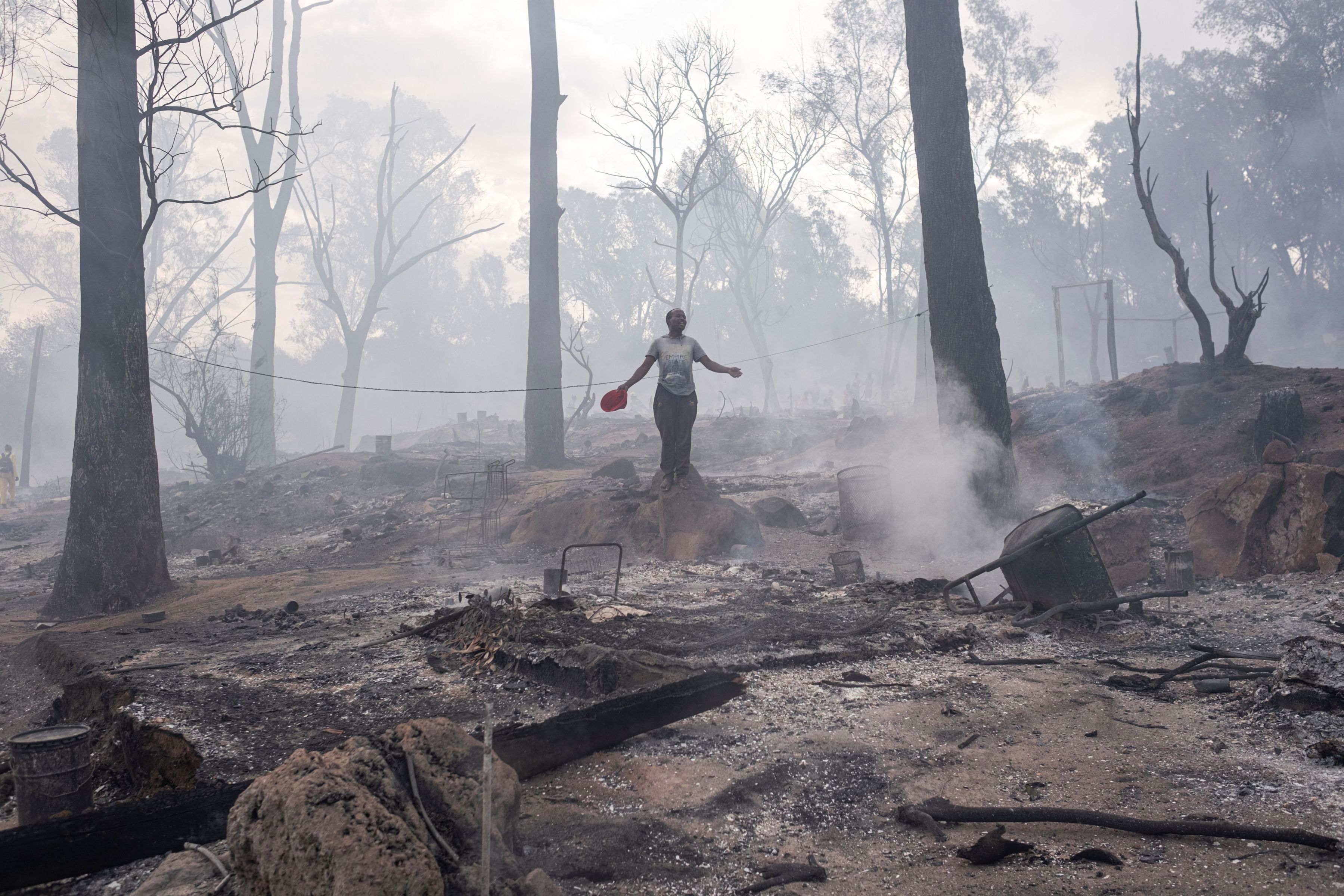 A resident of the Jakwa informal settlement guestures after a fire burned through around 300 shacks in Bryanston near Johannesburg on December 2, 2024. (Photo by Emmanuel Croset/AFP Photo)