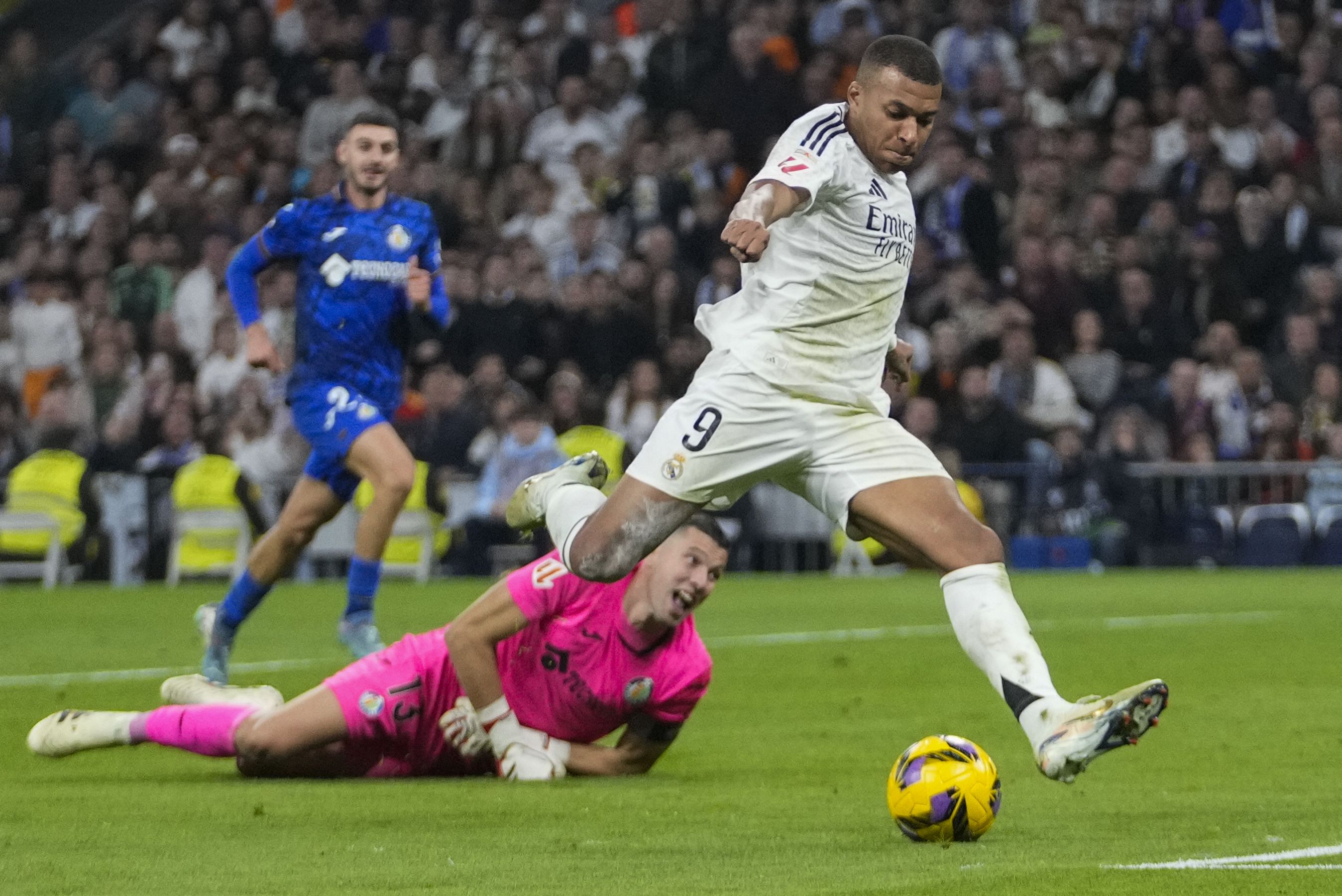 Real Madrid's Kylian Mbappe kicks the ball in an attempt to score during the Spanish La Liga soccer match between Real Madrid and Getafe at the Santiago Bernabeu Stadium in Madrid, Spain, Sunday, December 1, 2024. (Photo by Bernat Armangue/AP Photo)