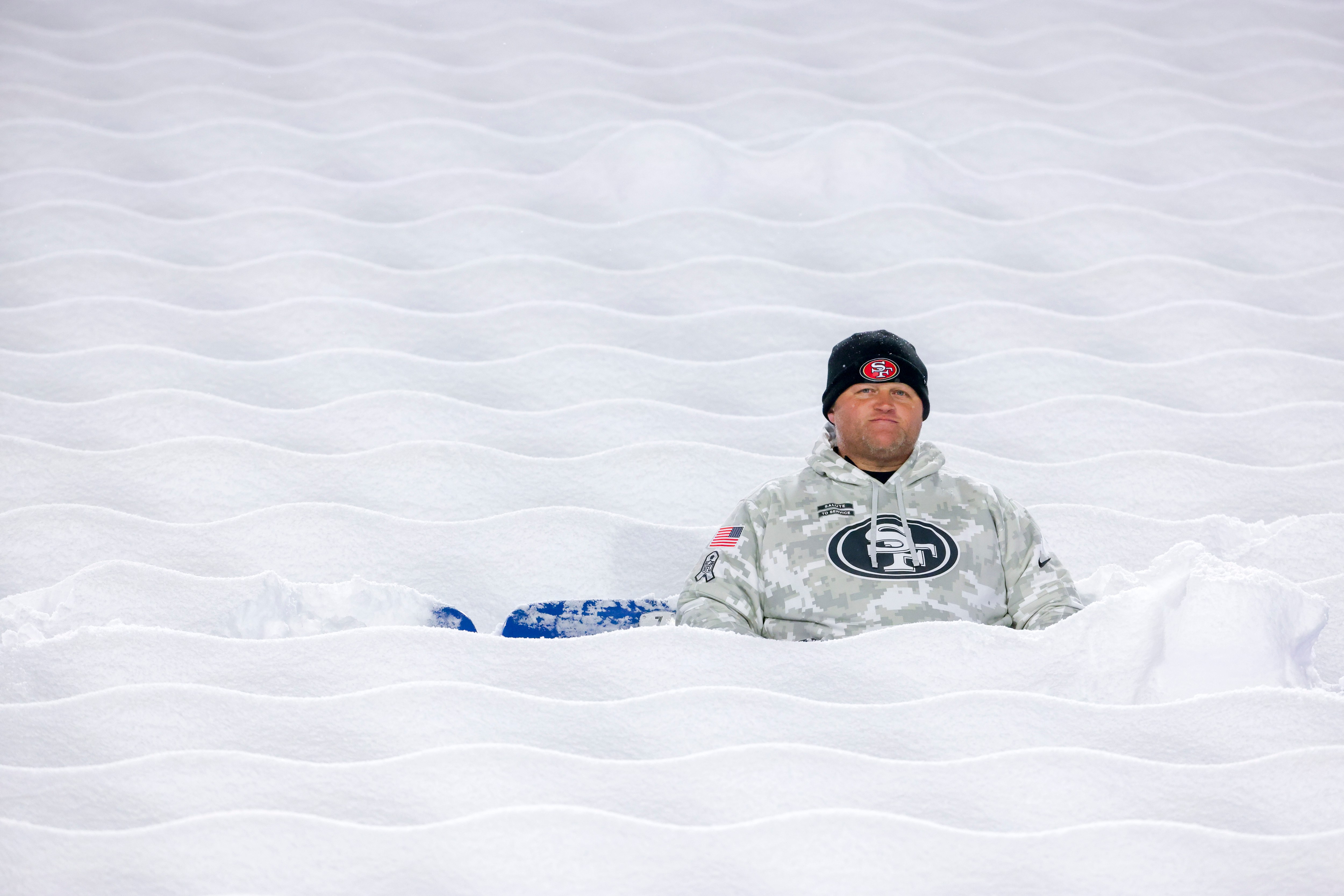 A fan of the San Francisco 49ers looks on from his seat before a game between the 49ers and the Buffalo Bills at Highmark Stadium on December 01, 2024 in Orchard Park, New York. (Photo by Timothy T Ludwig/Getty Images)