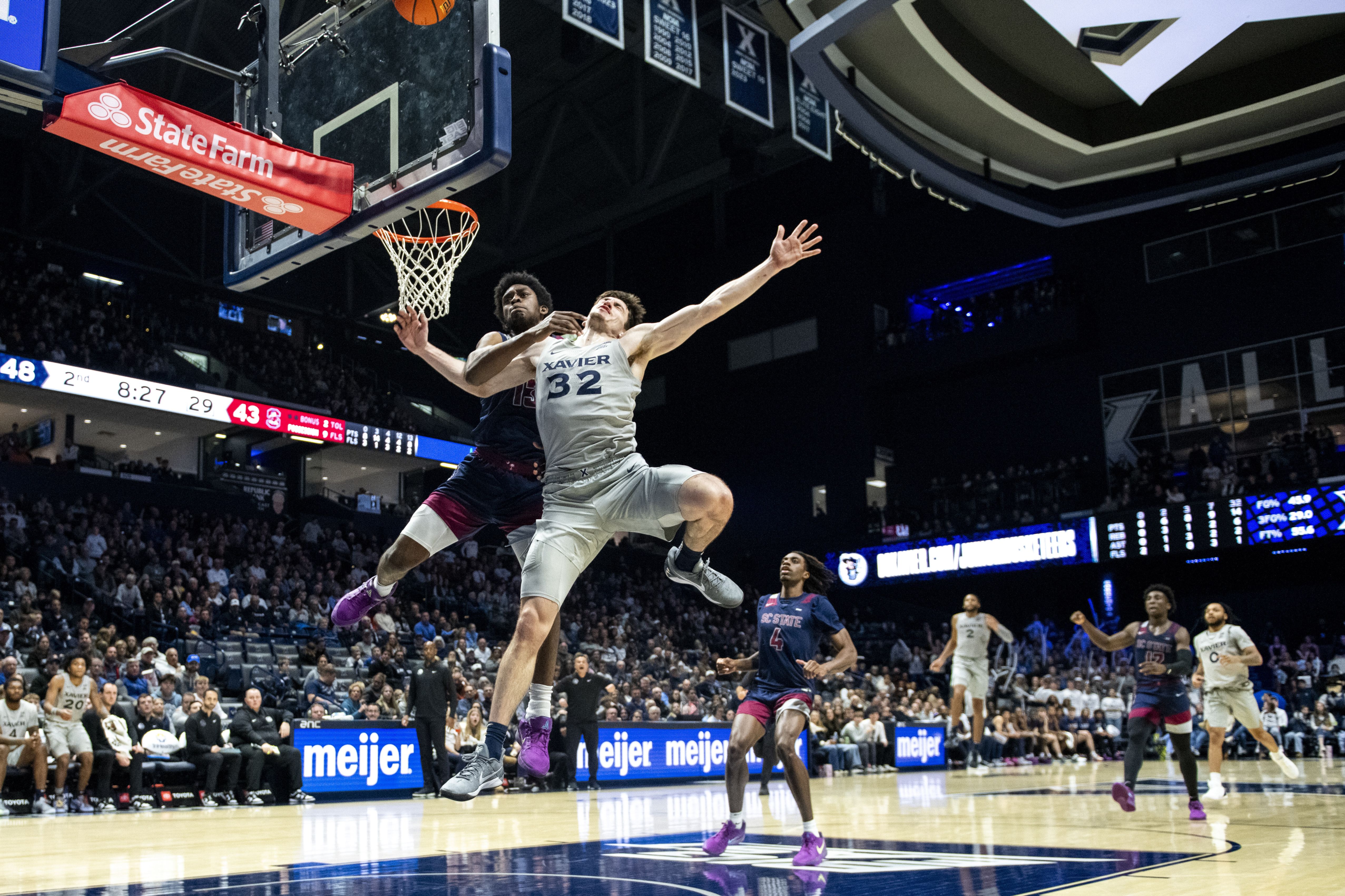 Xavier forward Zach Freemantle (32) is fouled by South Carolina State forward Drayton Jones during the second half of an NCAA college basketball game, Sunday, December 1, 2024, in Cincinnati. (Photo by Tanner Pearson/AP Photo)
