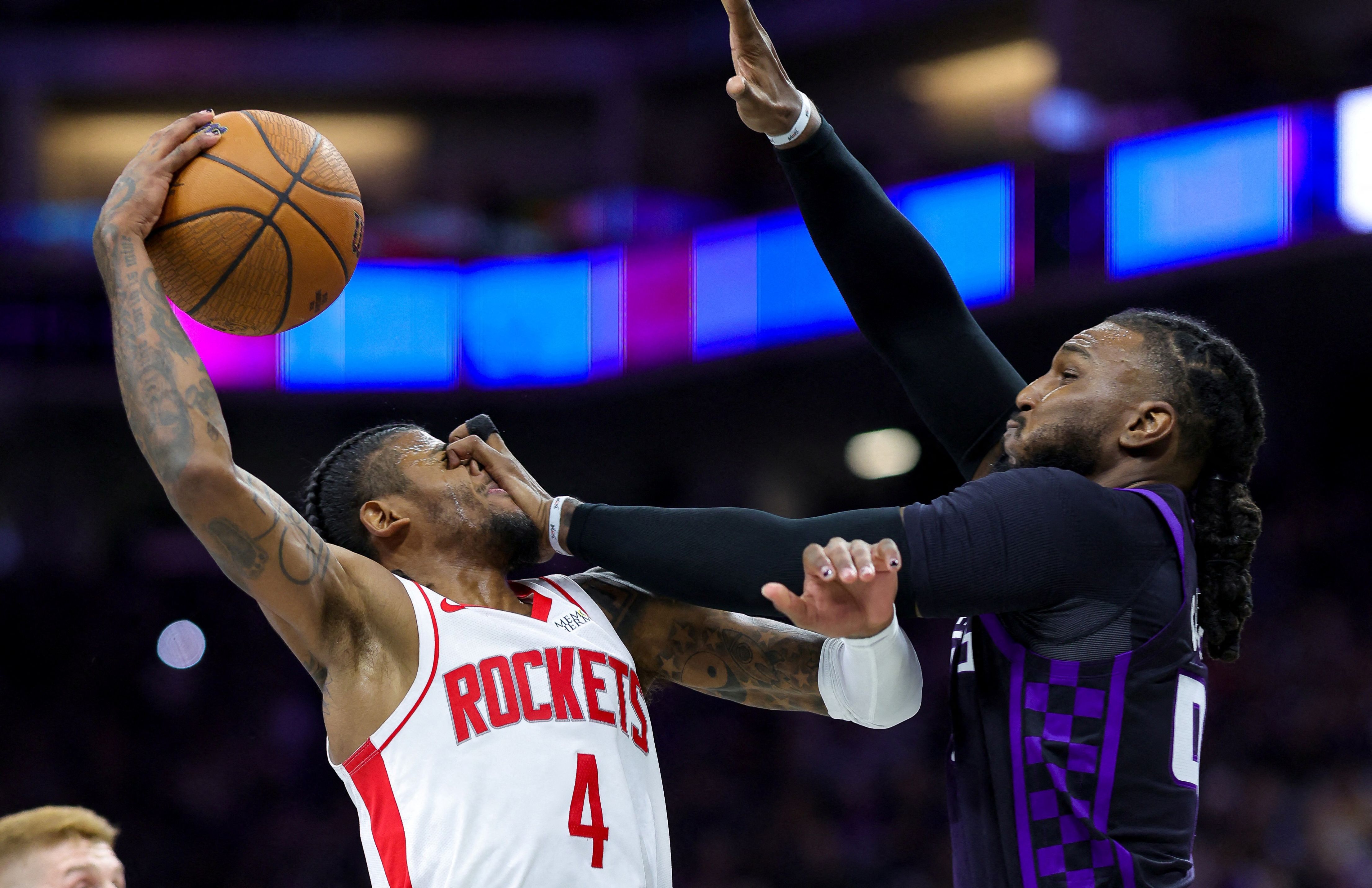 Houston Rockets guard Jalen Green (4) is fouled by Sacramento Kings forward Jae Crowder (99) during the fourth quarter at Golden 1 Center in Sacramento, California on December 3, 2024. (Photo by Sergio Estrada/USA Today Sports)