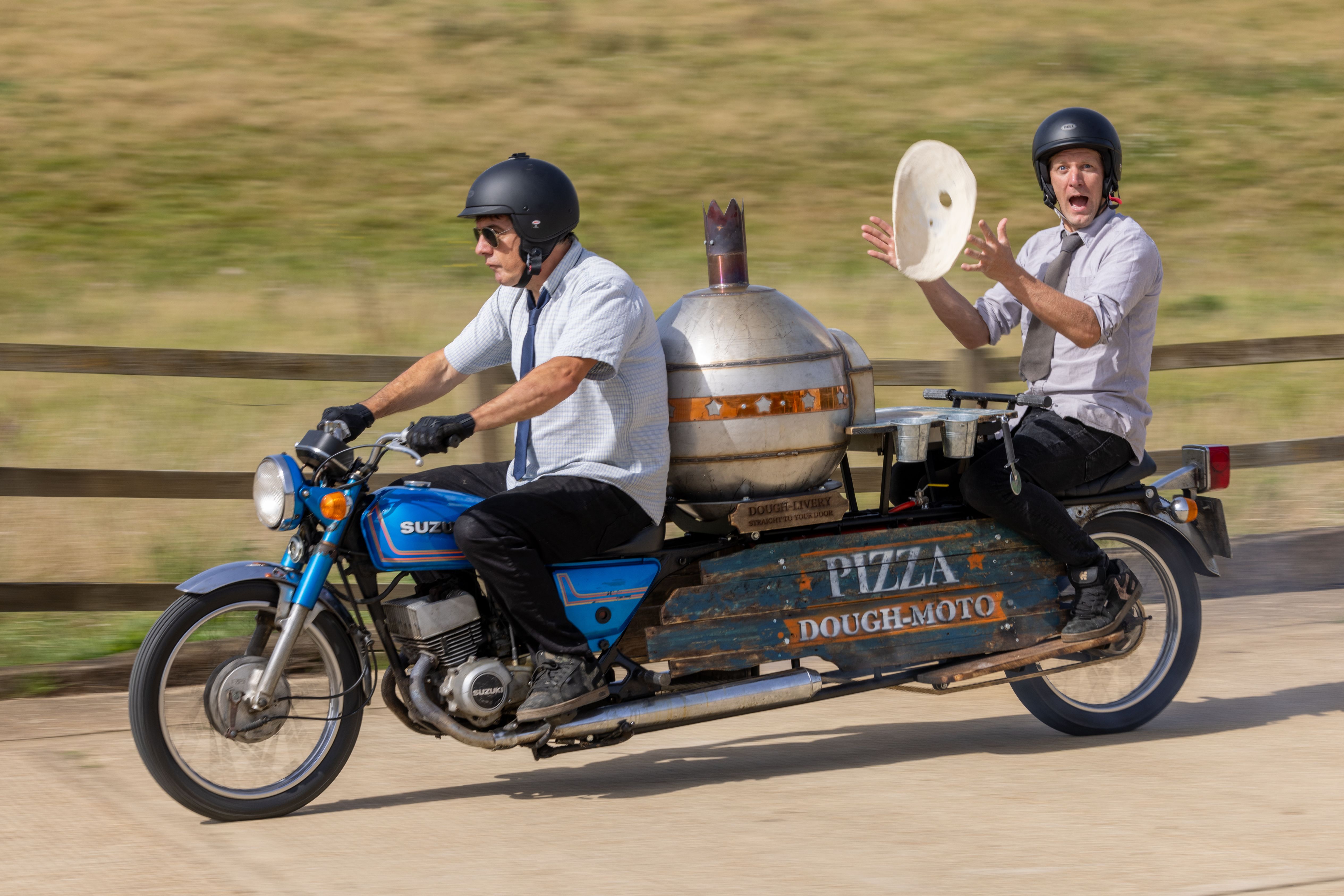 Colin Furze, 40, from Stamford, Lincolnshire, UK on September 7, 2023 makes a very thin base while speeding along on his latest invention: the only motorbike in the world with a built-in pizza oven. (Photo by Geoff Robinson/The Times)