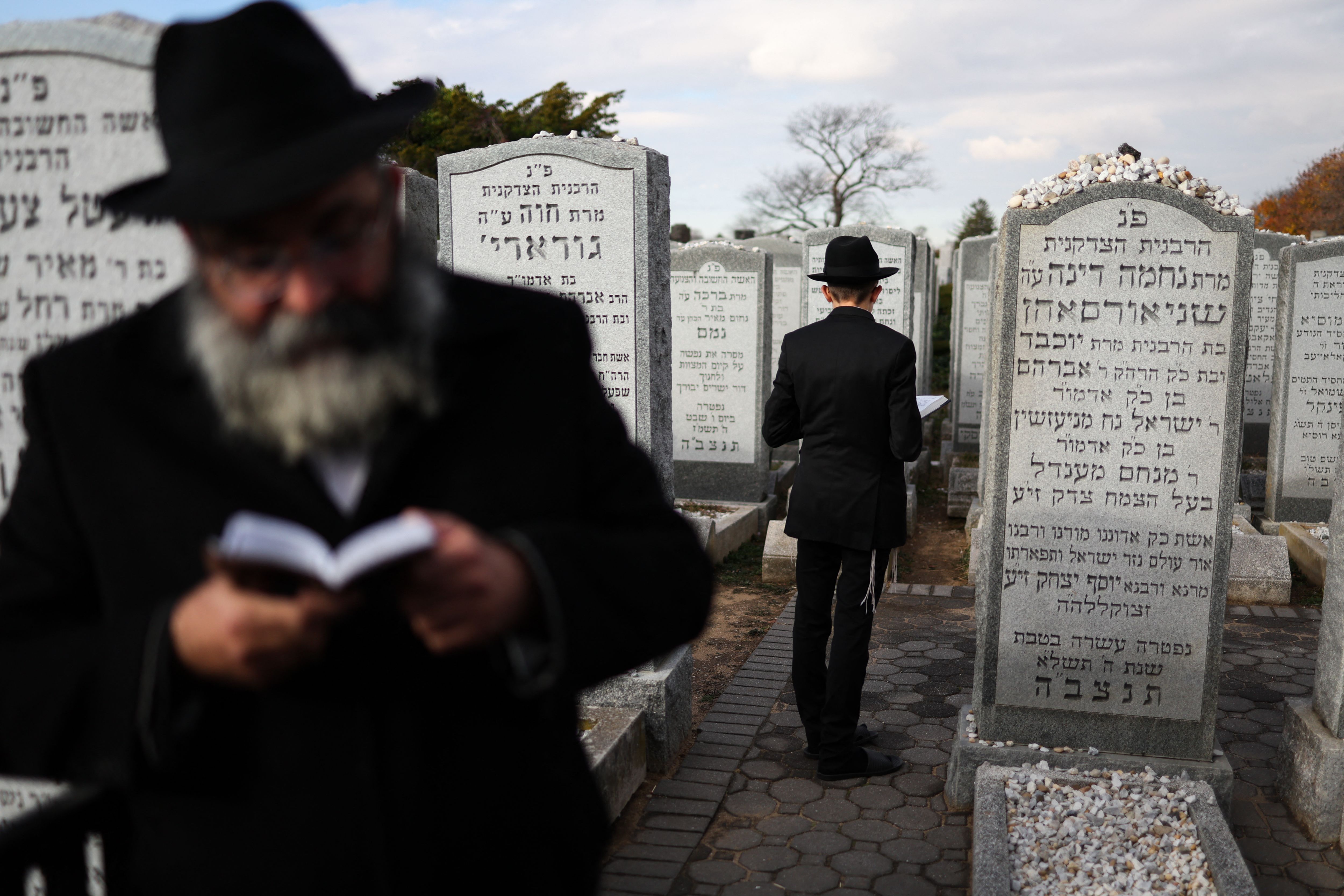 Chabad-Lubavitch rabbis gather in prayer at the resting place of the Rebbe Menachem M. Schneerson in the Old Montefiore Cemetery in the Queens borough of New York City on November 29, 2024. They are among the 6,500 rabbis and Jewish leaders from over 100 countries who have gathered in New York for the International Conference of Chabad-Lubavitch Emissaries, an annual event aimed at strengthening Jewish awareness and practice around the World. (Photo by Charly Triballeau/AFP Photo)