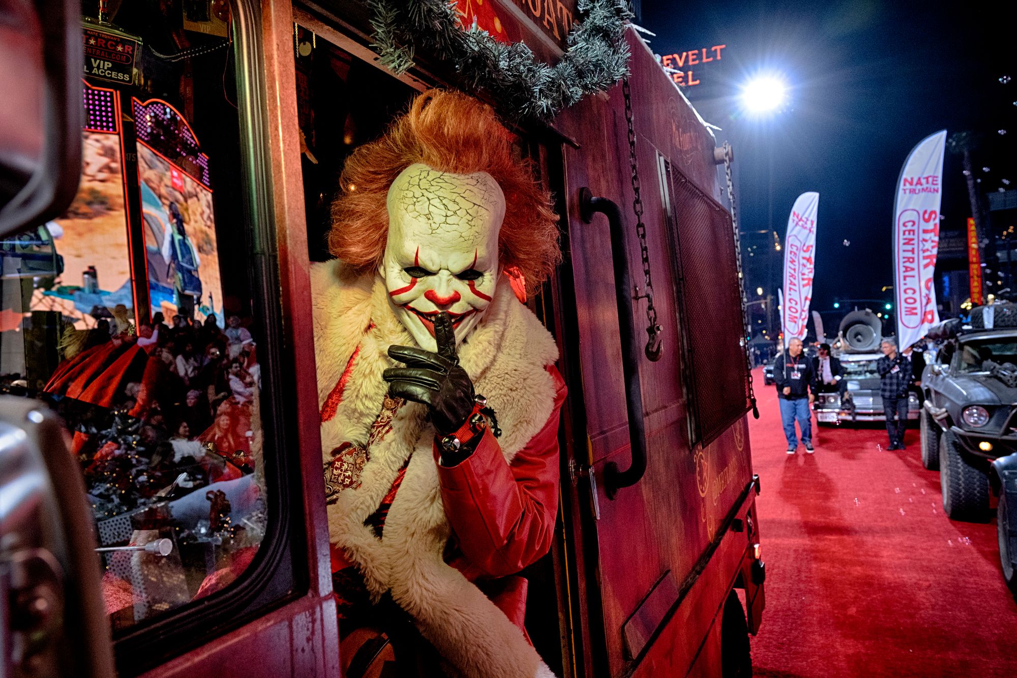 A character dressed as Pennywise rides in a van along Hollywood Blvd. during the 92nd Hollywood Christmas Parade in the Hollywood section of Los Angeles on Sunday December 1, 2024. (Photo by AP Photo)