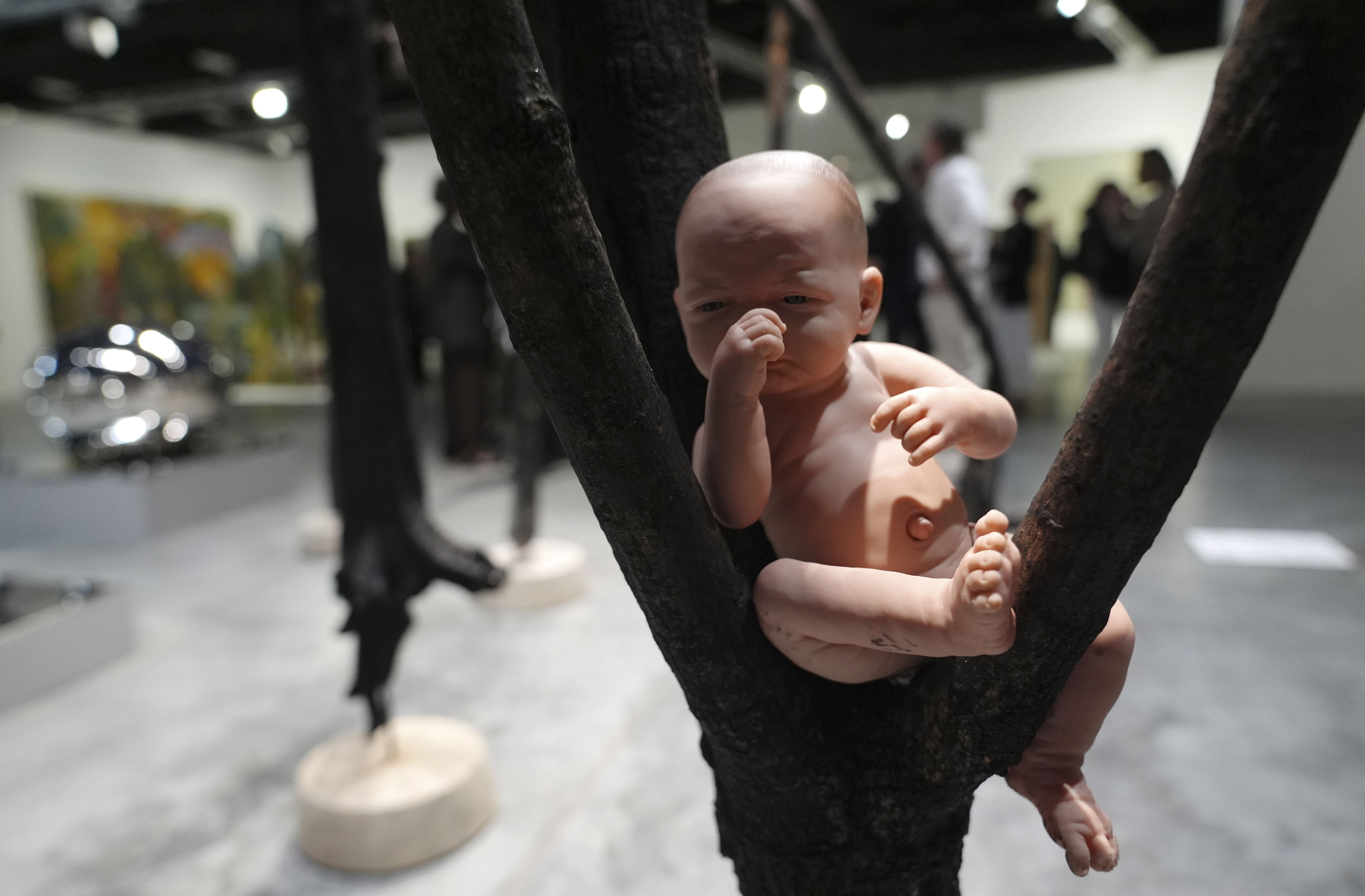 A “Baby of Hope” sits among charred wood in an art piece titled “Rebirth in the Inferno”, by artist Alan Sonfist, who is part of the Land Art Forward group, during Art Basel Miami Beach Wednesday, December 4, 2024, in Miami Beach, Fla. (Photo by Lynne Sladky/AP Photo)