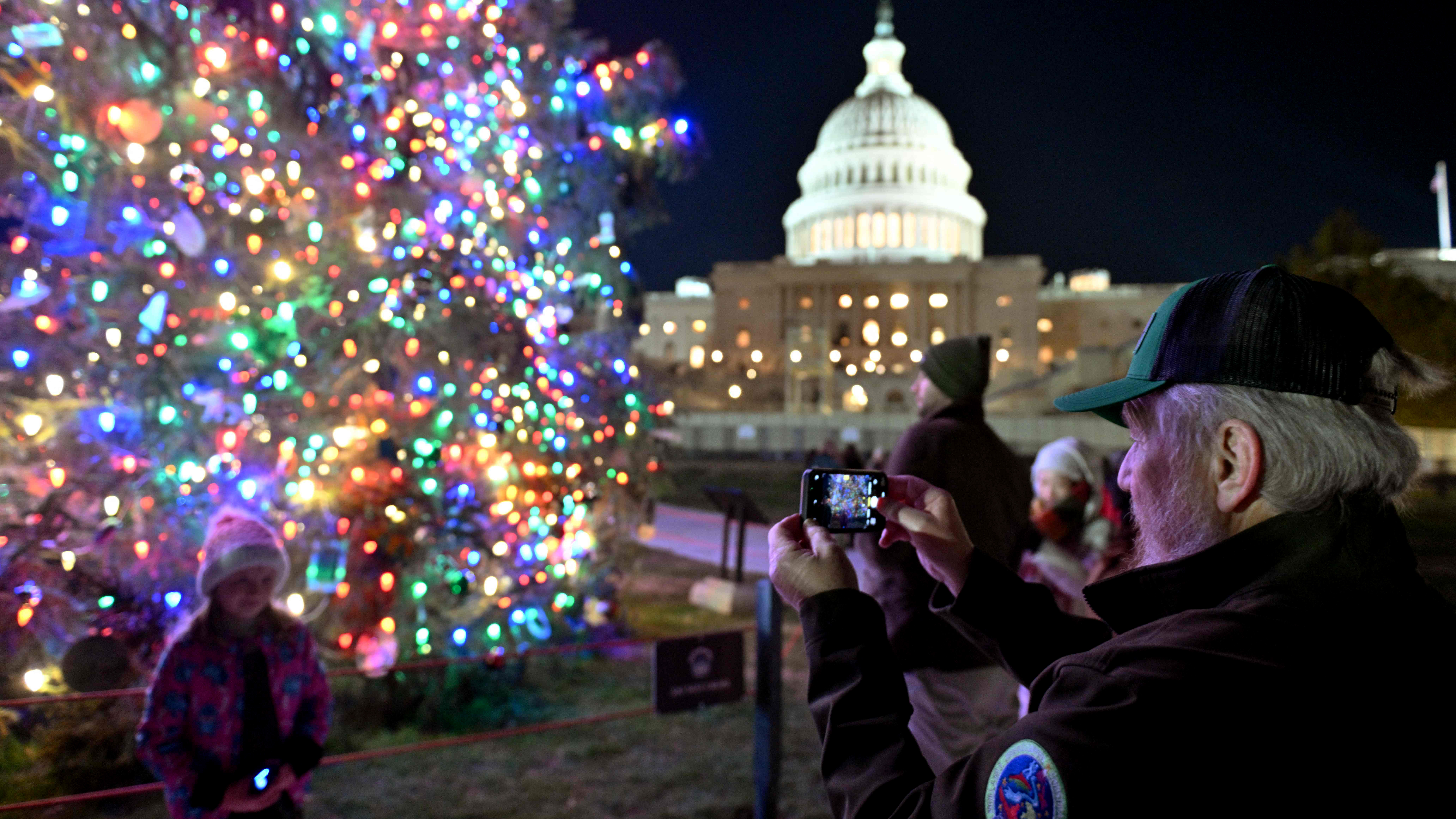 John Schank, one of the two drivers that drove the Christmas tree from the Pacific Coast to the Western lawn of the US Capitol building, takes a photograph of his nine-year-old grand niece, Amelia after the lights on the tree were turned on during a ceremony on Capitol Hill in Washington, DC, on December 3, 2024. The tree which was harvested in the Tongass National Forest in Alaska was shipped from Wrangell, Alaska, to the West Lawn of the US Capitol building. (Photo by Roberto Schmidt/AFP Photo)