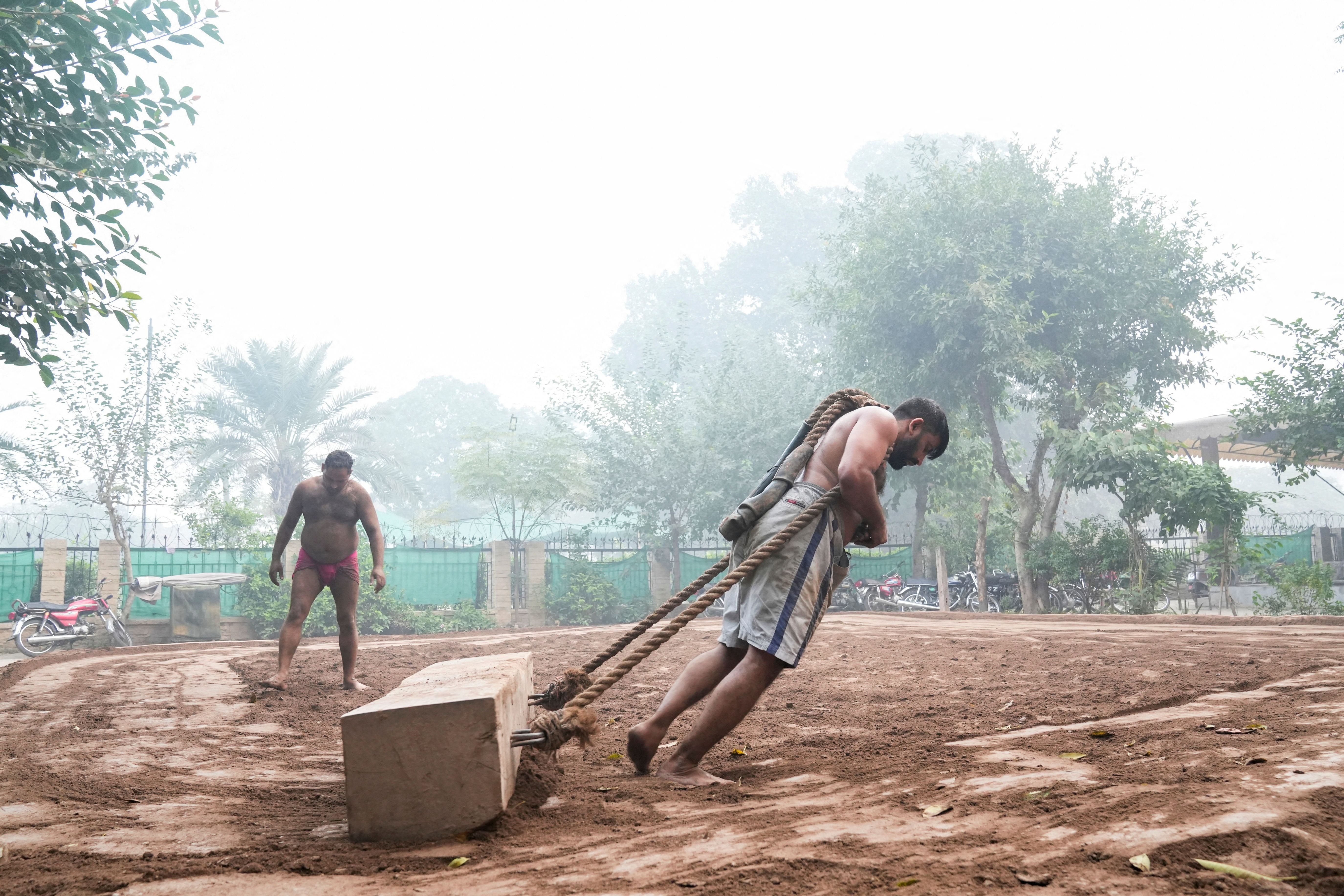 Gulzar and Sikandar use a wooden block to level the ground for traditional mud wrestling amid early morning smog at Greater Iqbal Park in Lahore, Pakistan on November 7, 2024. (Photo by Nida Mehboob/Reuters)