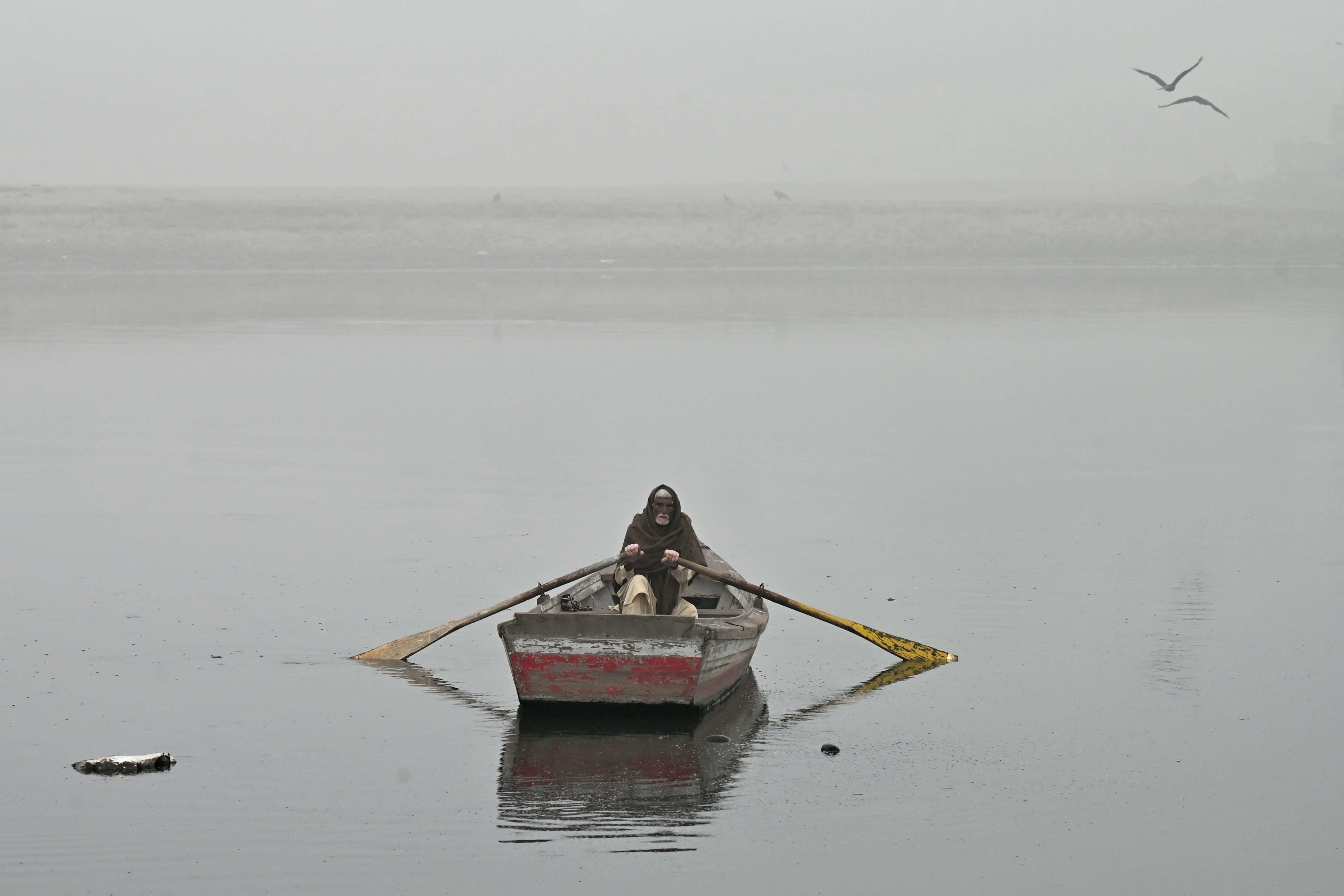 A man rows his boat in the waters of river Ravi engulfed in smog in Lahore on November 13, 2024. Lahore – a city of 14 million people stuffed with factories on the border with India – regularly ranks among the world's most polluted cities, but it has hit record levels this month. (Photo by Arif Ali/AFP Photo)