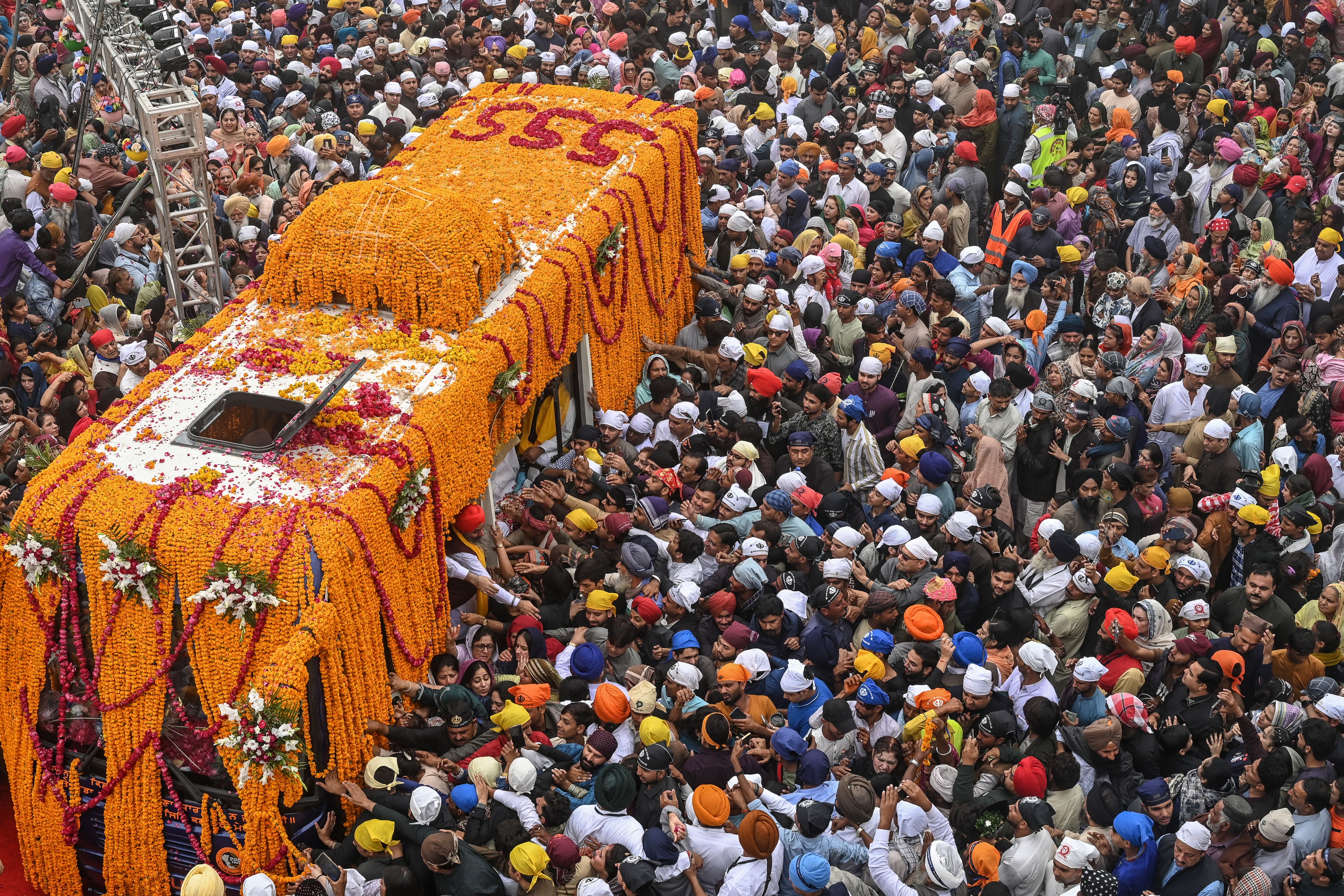 Sikh devotees gather around a bus carrying the Guru Granth Sahib, the Sikh holy book, during a religious procession on the occasion of the birth anniversary of Guru Nanak Dev, the founder of Sikhism, in Nankana Sahib, in the Punjab province of Pakistan, on November 15, 2024. (Photo by Arif Ali/AFP Photo)