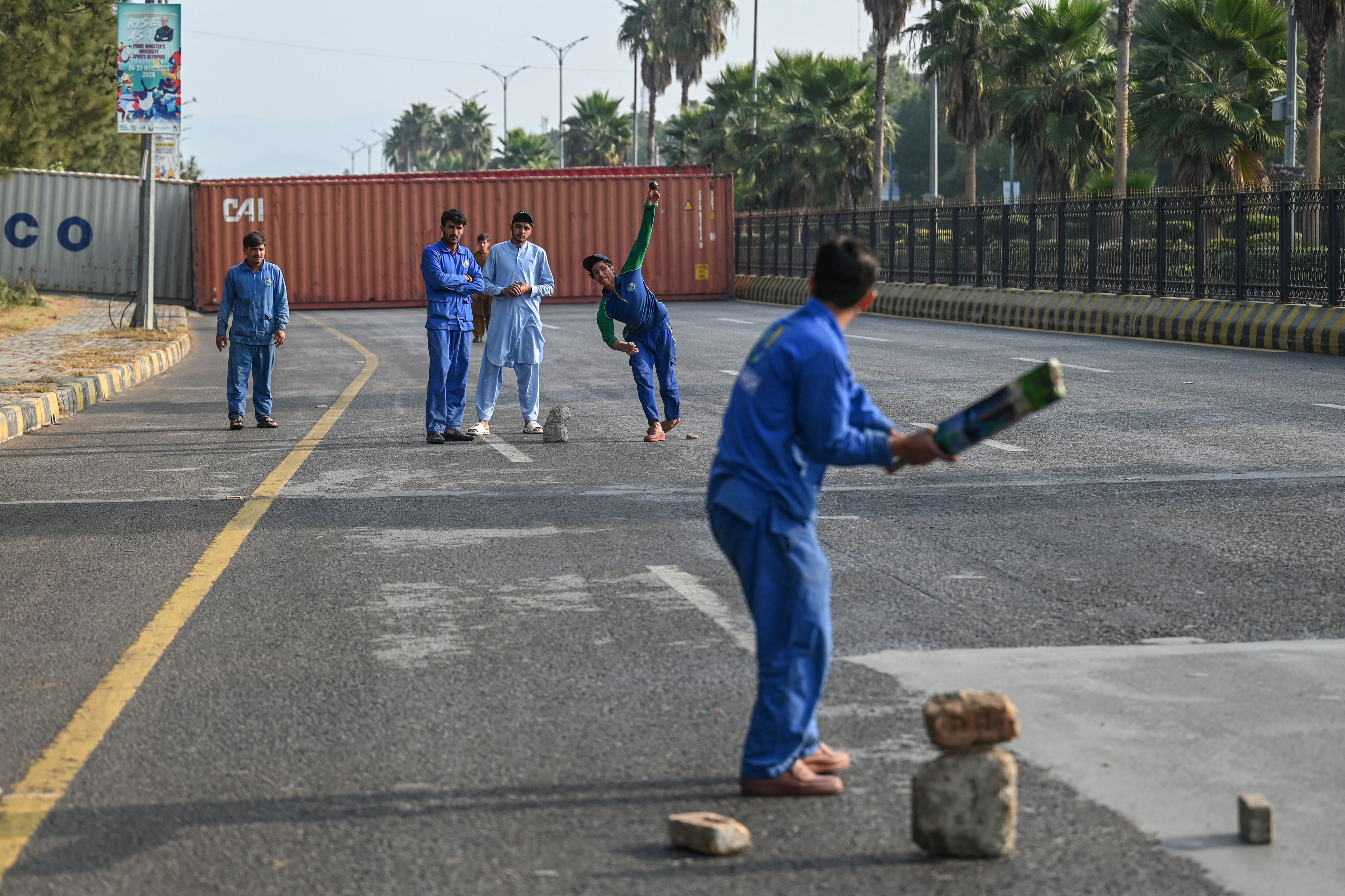 Employees of a fuel station play cricket on a deserted road blocked with shipping containers near the Red Zone area ahead of a protest rally by supporters of jailed former prime minister Imran Khan's Pakistan Tehreek-e-Insaf (PTI) party in Islamabad on November 24, 2024. Authorities blocked roads in Islamabad with shipping containers and beefed up security after jailed opposition leader Imran Khan's party called for fresh protests to demand his release. (Photo by Aamir Qureshi/AFP Photo)