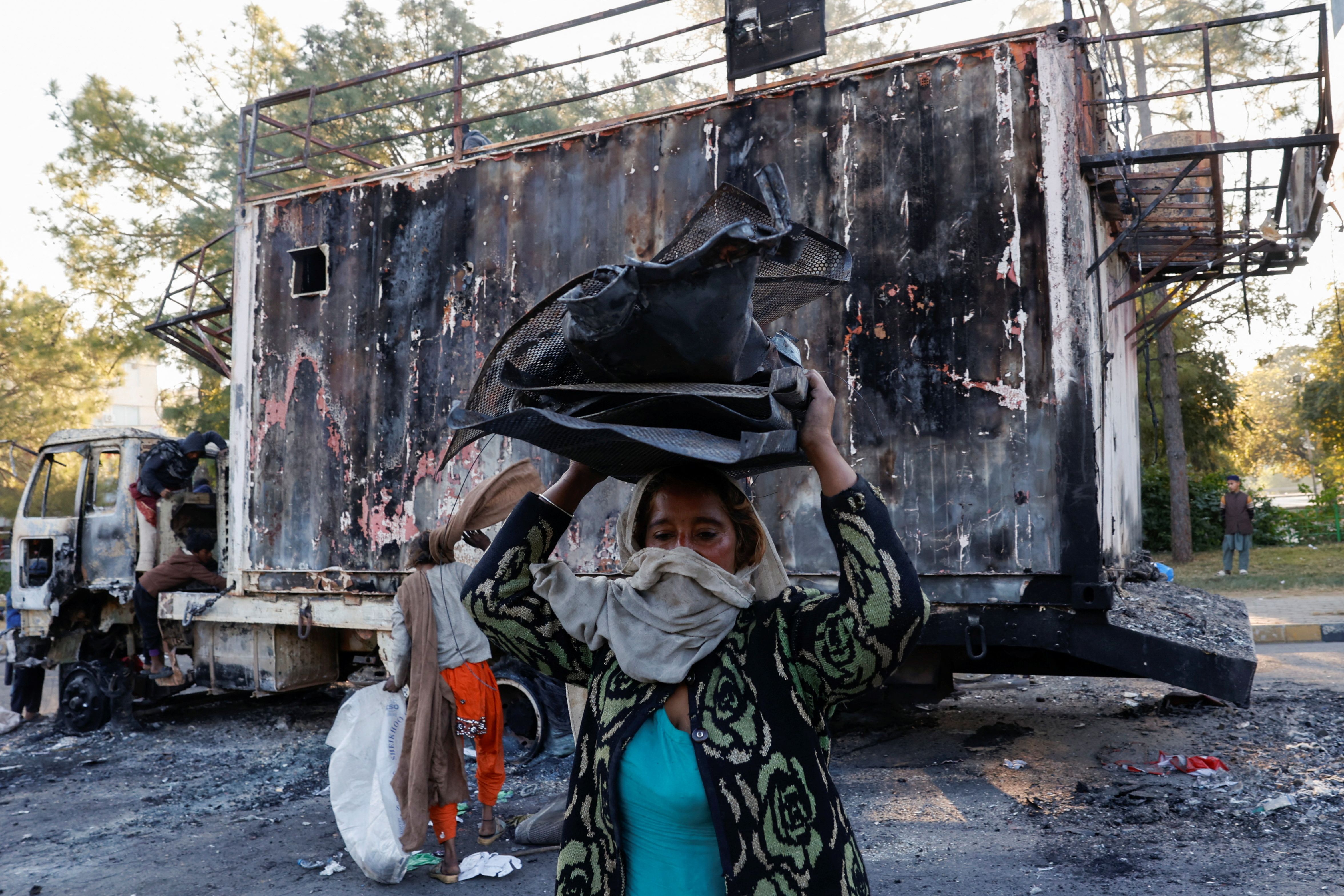 A woman carries recyclables from the burnt truck used by Bushra Bibi, wife of jailed former Pakistani Prime Minister Imran Khan, after security forces launched a raid on supporters of Khan's party Pakistan Tehreek-e-Insaf (PTI) who had stormed the capital demanding his release on Tuesday, in Islamabad, Pakistan, on November 27, 2024. (Photo by Akhtar Soomro/Reuters)
