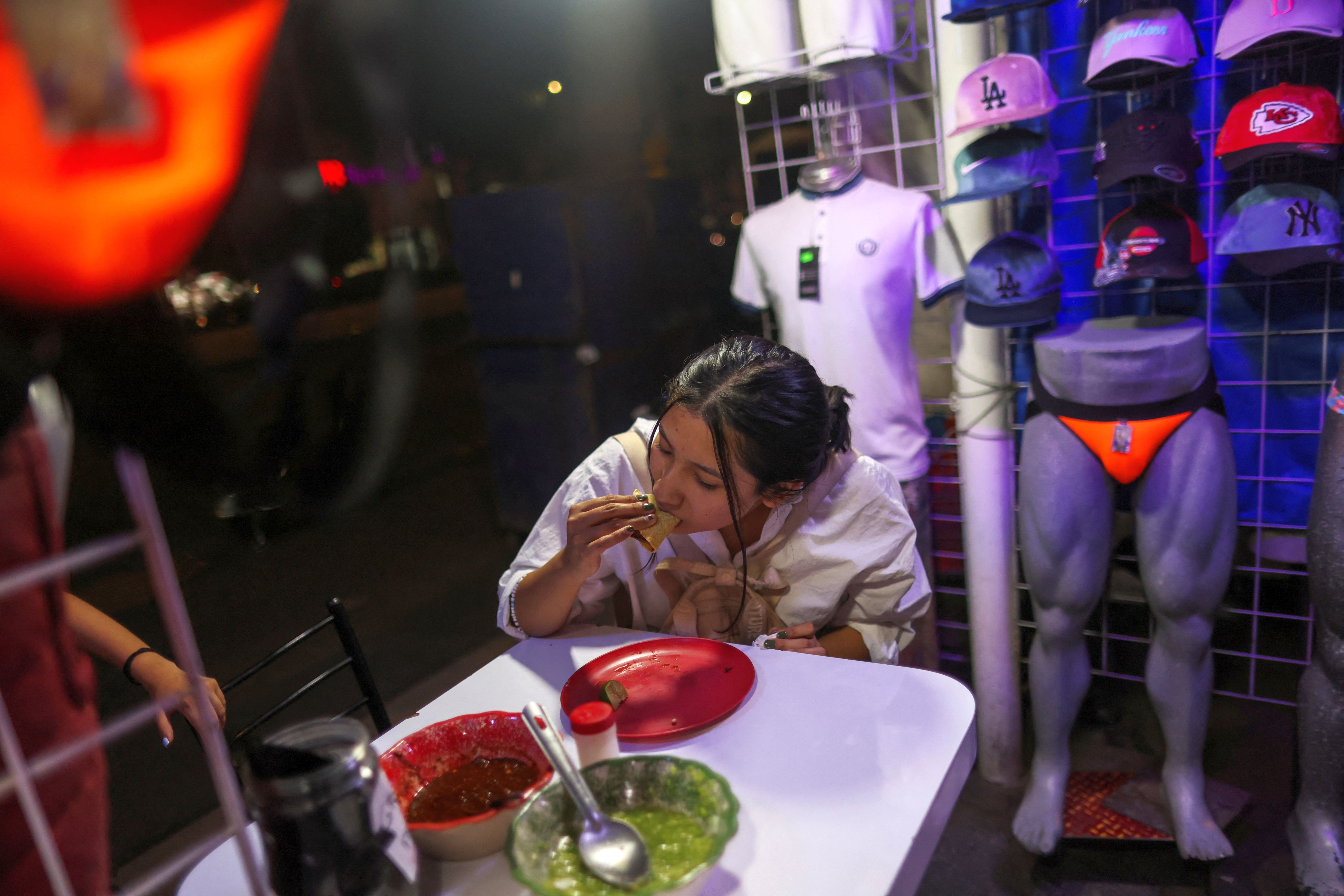 A woman eats tacos at the Taqueria El Califa de Leon, which recently earned one star in the Michelin Guide, in Mexico City, Mexico, on May 16, 2024. (Photo by Gustavo Graf/Reuters)