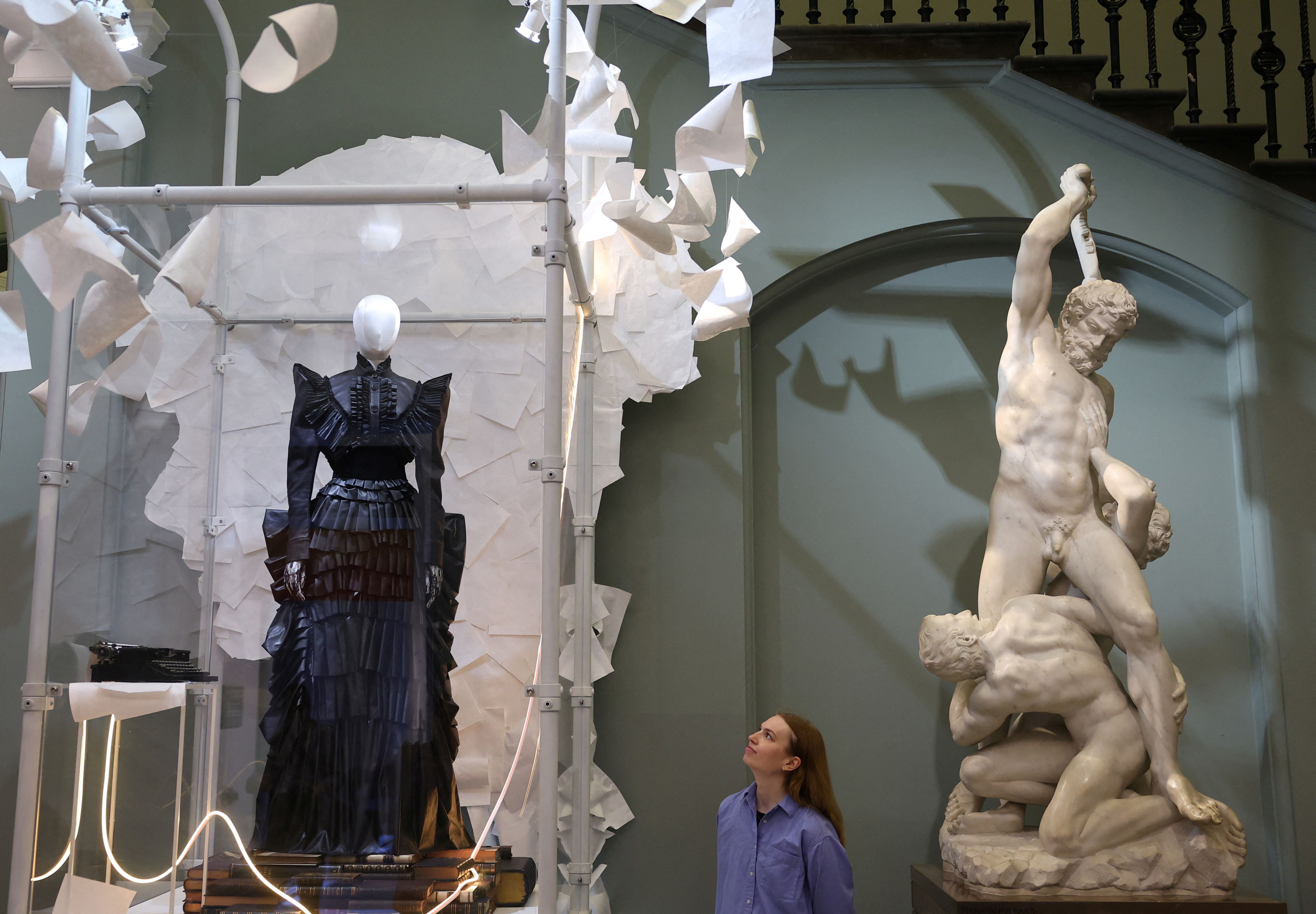 Employee Abbey poses as she views an outfit from the “Fortnight” video worn and loaned by Taylor Swift, which forms part of the Taylor Swift Songbook Trail exhibition celebrating the work of the music artist at the V&A Museum in London, Britain, on July 24, 2024. (Photo by /Reuters)