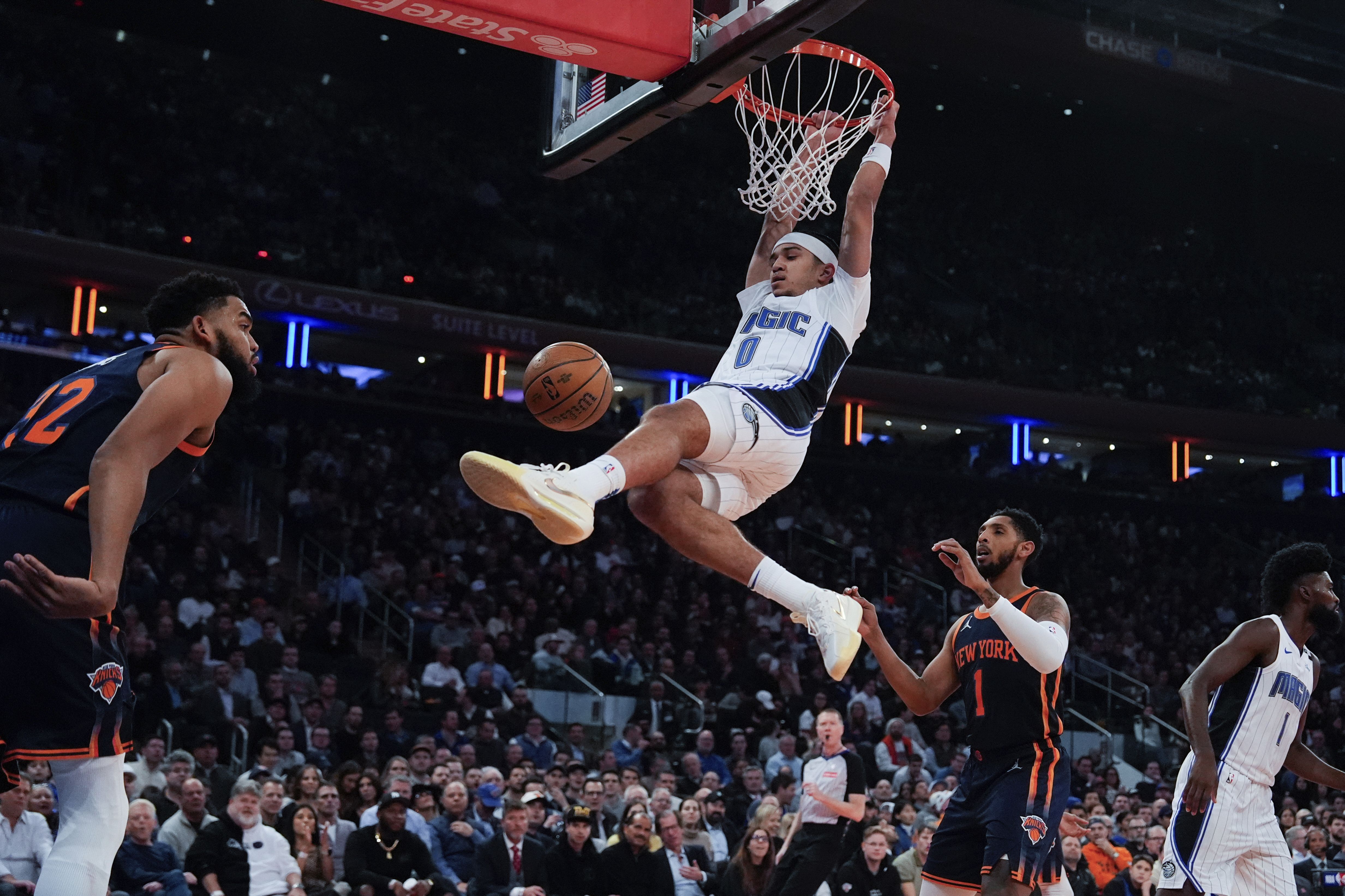 Orlando Magic guard Anthony Black (0) dunks during the first half of an NBA Cup basketball game against the New York Knicks, Tuesday, December 3, 2024, in New York, N.Y. (Photo by Julia Demaree Nikhinson/AP Photo)
