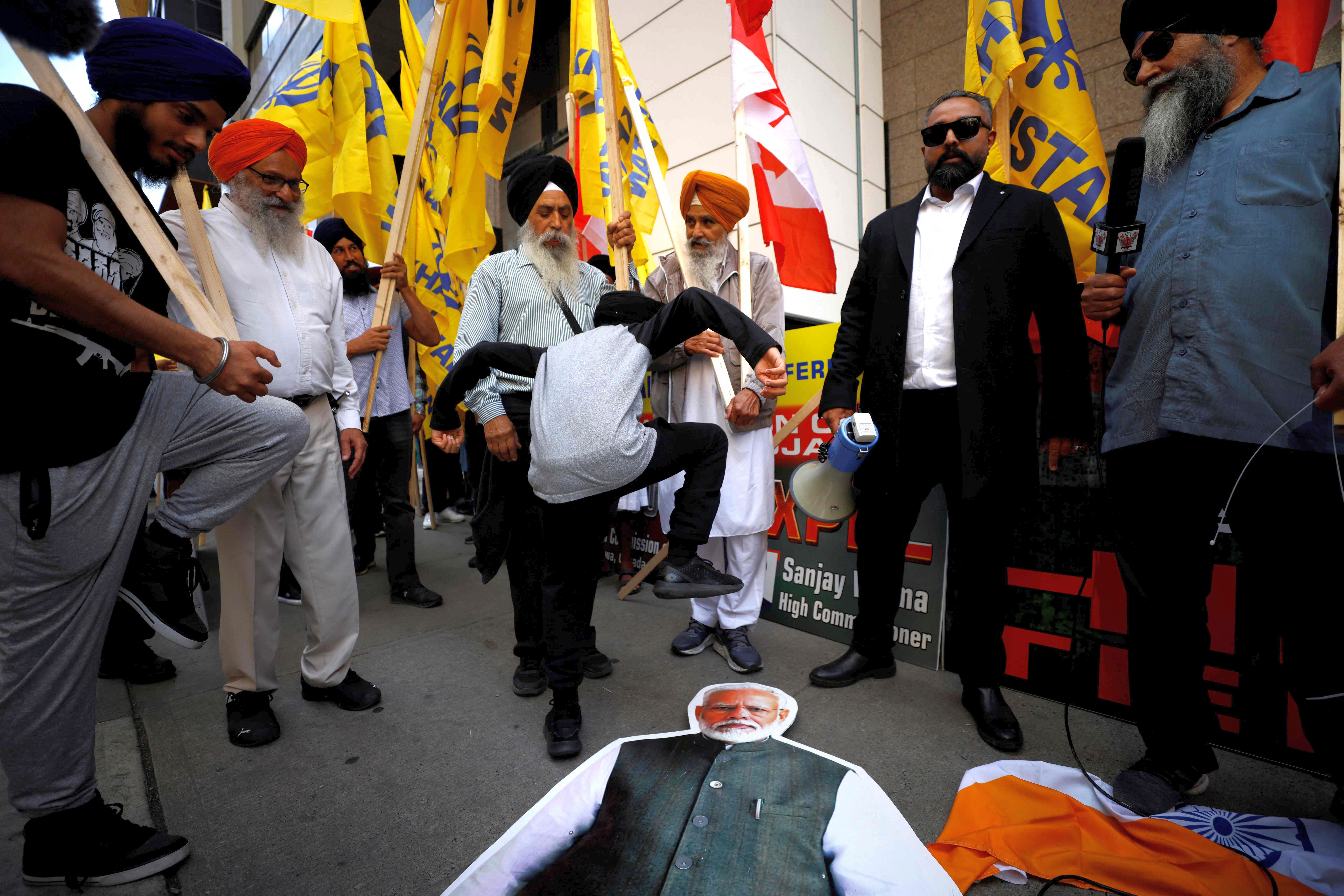 People deface a placard depicting Indian prime minister Narendra Modi during a Sikh rally outside the Indian consulate in Toronto to raise awareness for the Indian government's alleged involvement in the killing of Sikh separatist Hardeep Singh Nijjar in British Columbia on September 25, 2023. Prime Minister Justin Trudeau's assertion on September 17, 2023 that agents linked to New Delhi may have been responsible for the June 18 murder of Hardeep Singh Nijjar, a Canadian citizen, sent shockwaves through both countries, prompting the reciprocal expulsion of diplomats. (Photo by Cole Burston/AFP Photo)