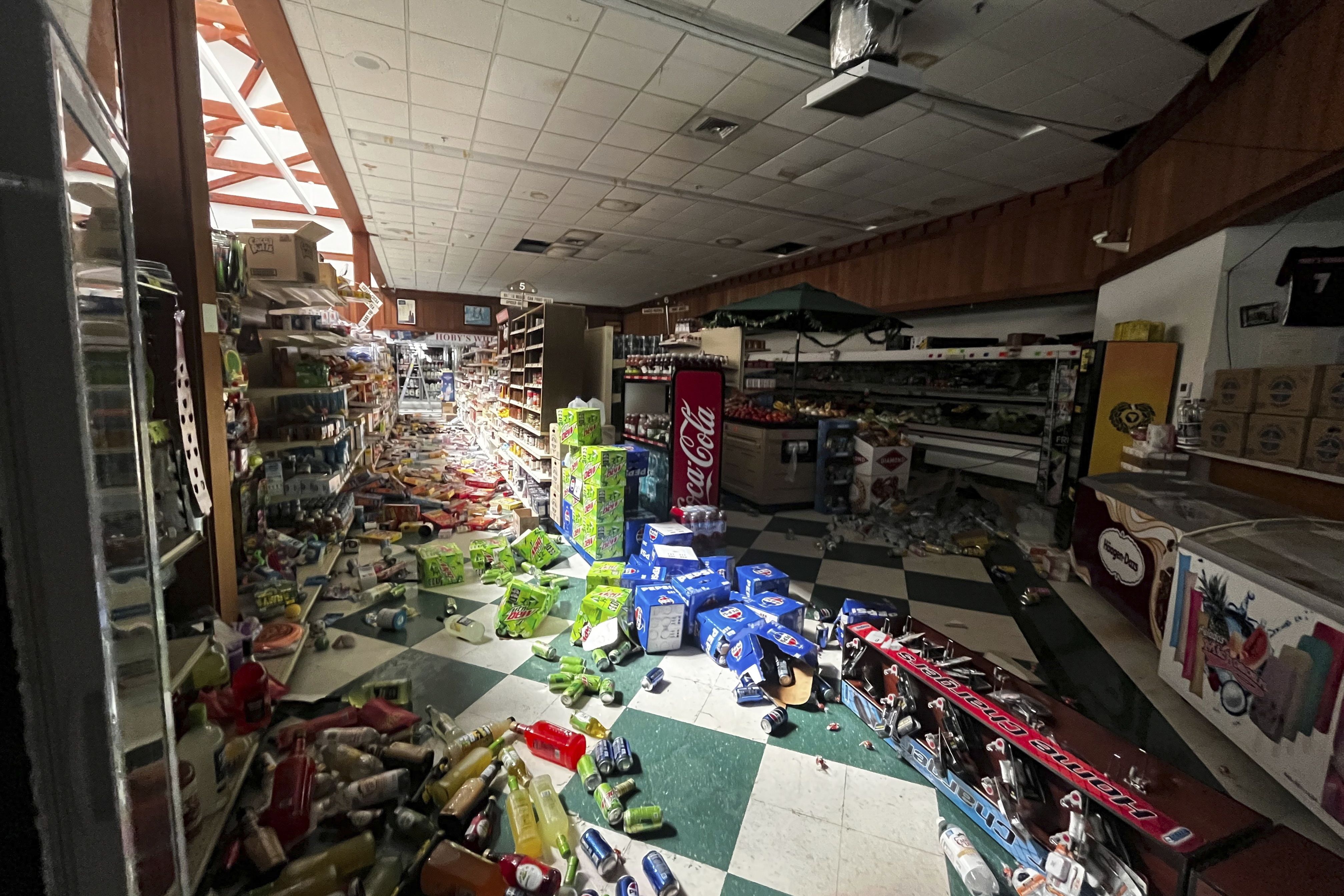 Drinks and other food items are toppled on the floor inside Hoby's Market and Deli after an earthquake Thursday, December 5, 2024, in Scotia, Calif. (Photo by Dylan McNeill/The Times-Standard via AP Photo)
